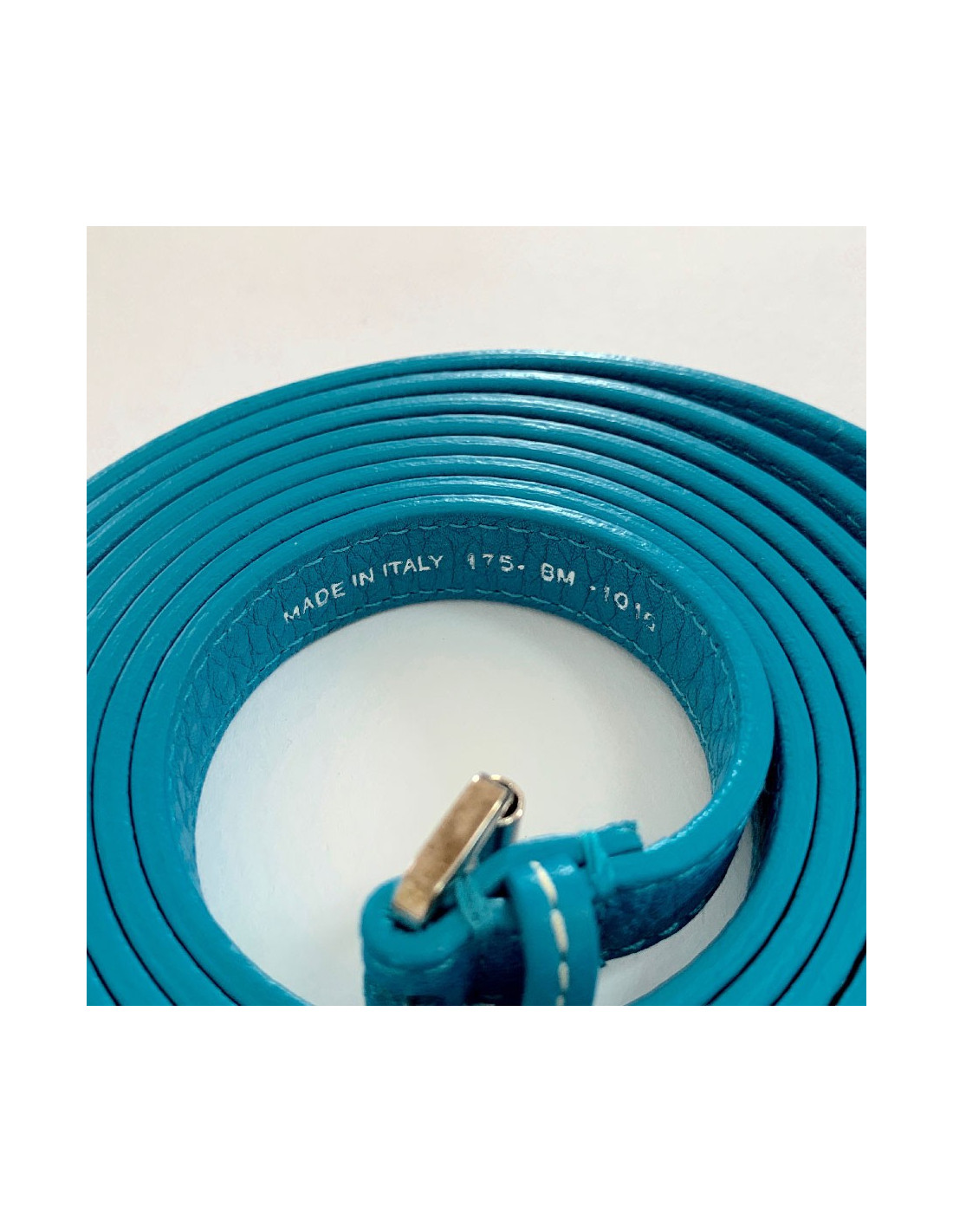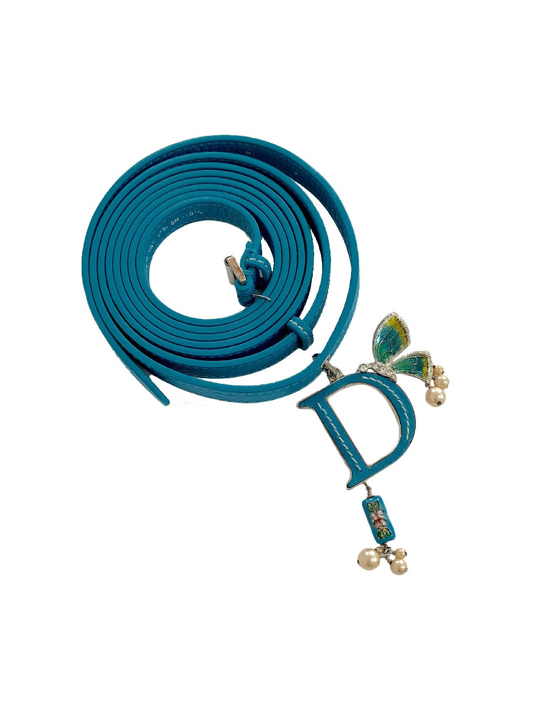 Très belle ceinture, double tour, CHRISTIAN DIOR, bleu turquoise. Elle est agrémentée d'un charm représentant la lettre D de Dior. Ce charm est en métal argenté recouvert de cuir et décoré d'un papillon multicolore serti de strass, perles. fabrication italienne.