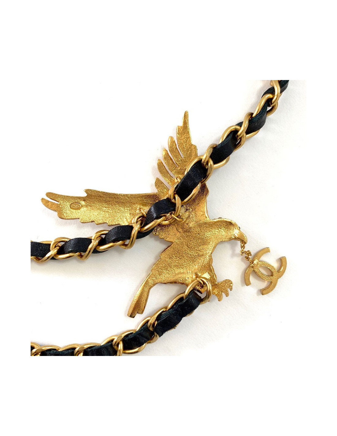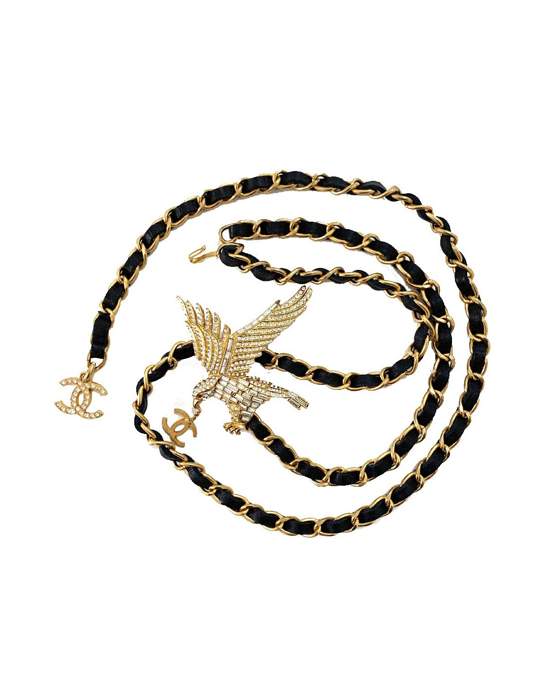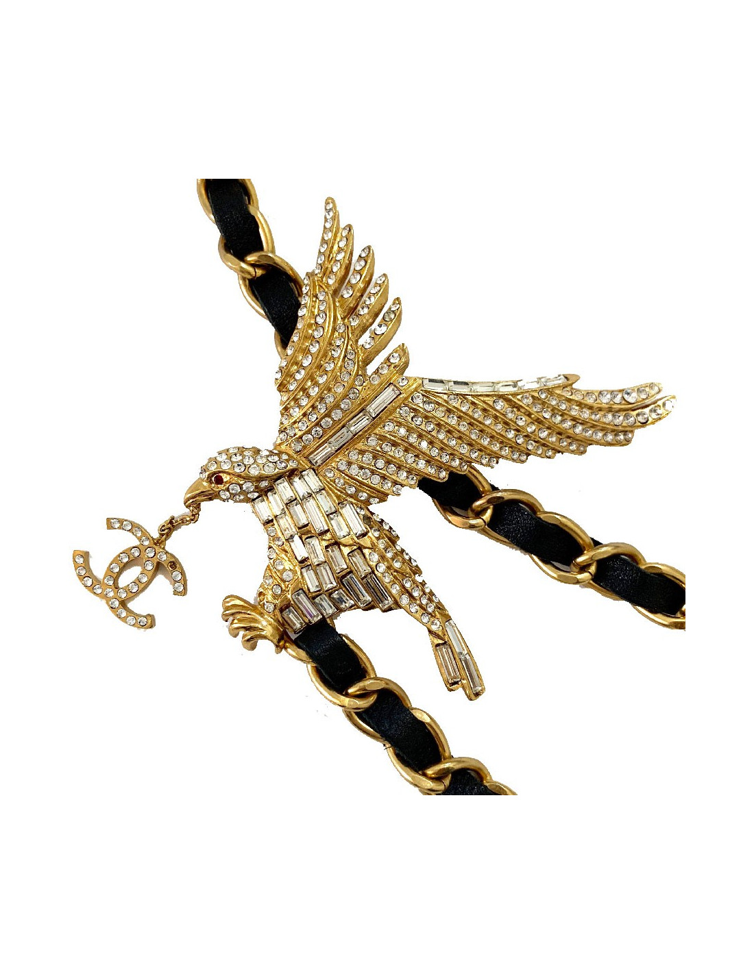 Couture! Très belle ceinture fine de la Maison CHANEL en métal doré entrelacé de cuir noir. Un aigle entièrement serti de strass de formes rondes et formes baguettes lie les 2 rangés de chaines cuir et métal sur le devant. Il tient dans son bec un CC en strass également. Fermoir crochet.