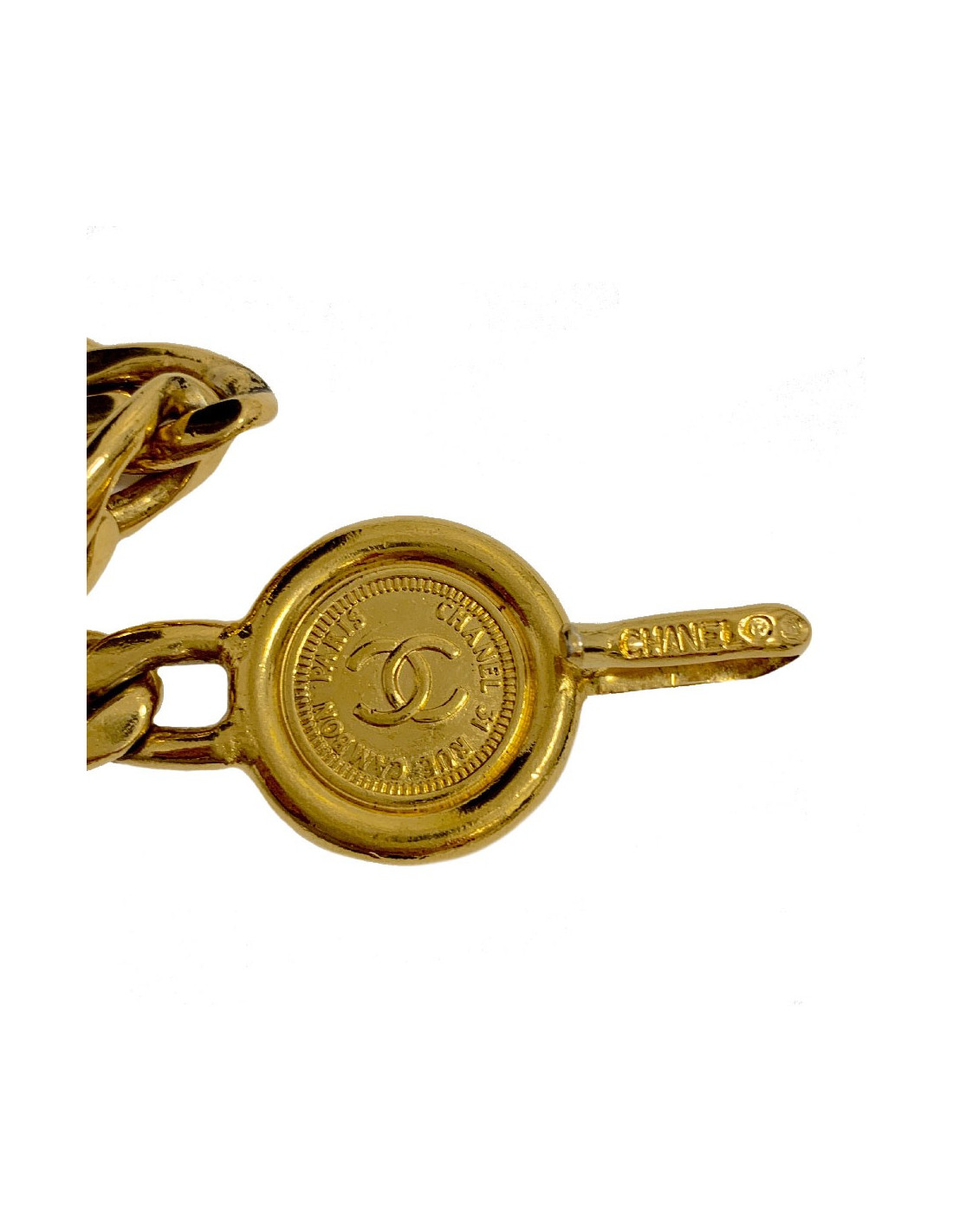 Vintage et iconique! Superbe ceinture de la maison CHANEL, en chaîne dont les maillons sont en laiton doré, agrémentée de 2 médailles sur lesquelles il y a un CC et l'inscription CHANEL, 31 RUE CAMBON PARIS. Ceinture de l'époque des tops Models tels que Claudia Schiffer. Vous pouvez la porter aussi bien sur une jupe, que sur une robe ou un pantalon.