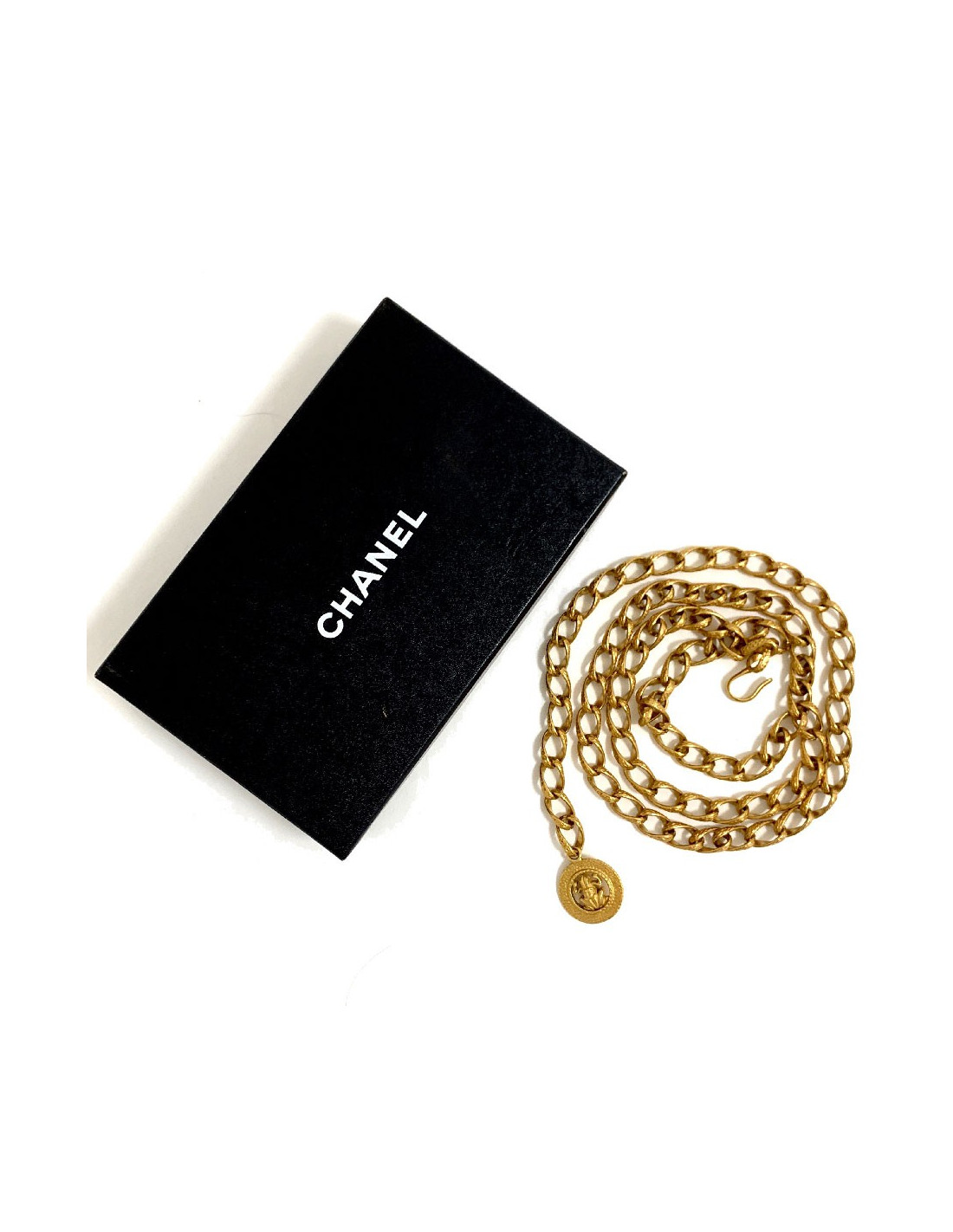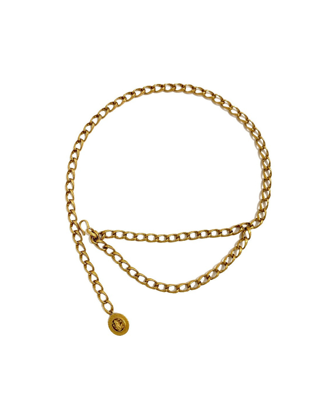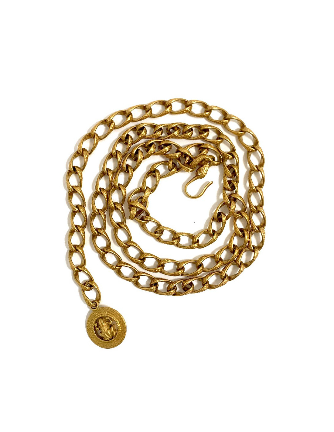Superbe ceinture chaine de la Maison CHANEL en maille torsadée et pendentif rond en métal or vieilli. Ce pendentif rond contient une grenouille avec un CC sur son dos. Fermoir crochet qui vous permet de porter la ceinture à votre guise.