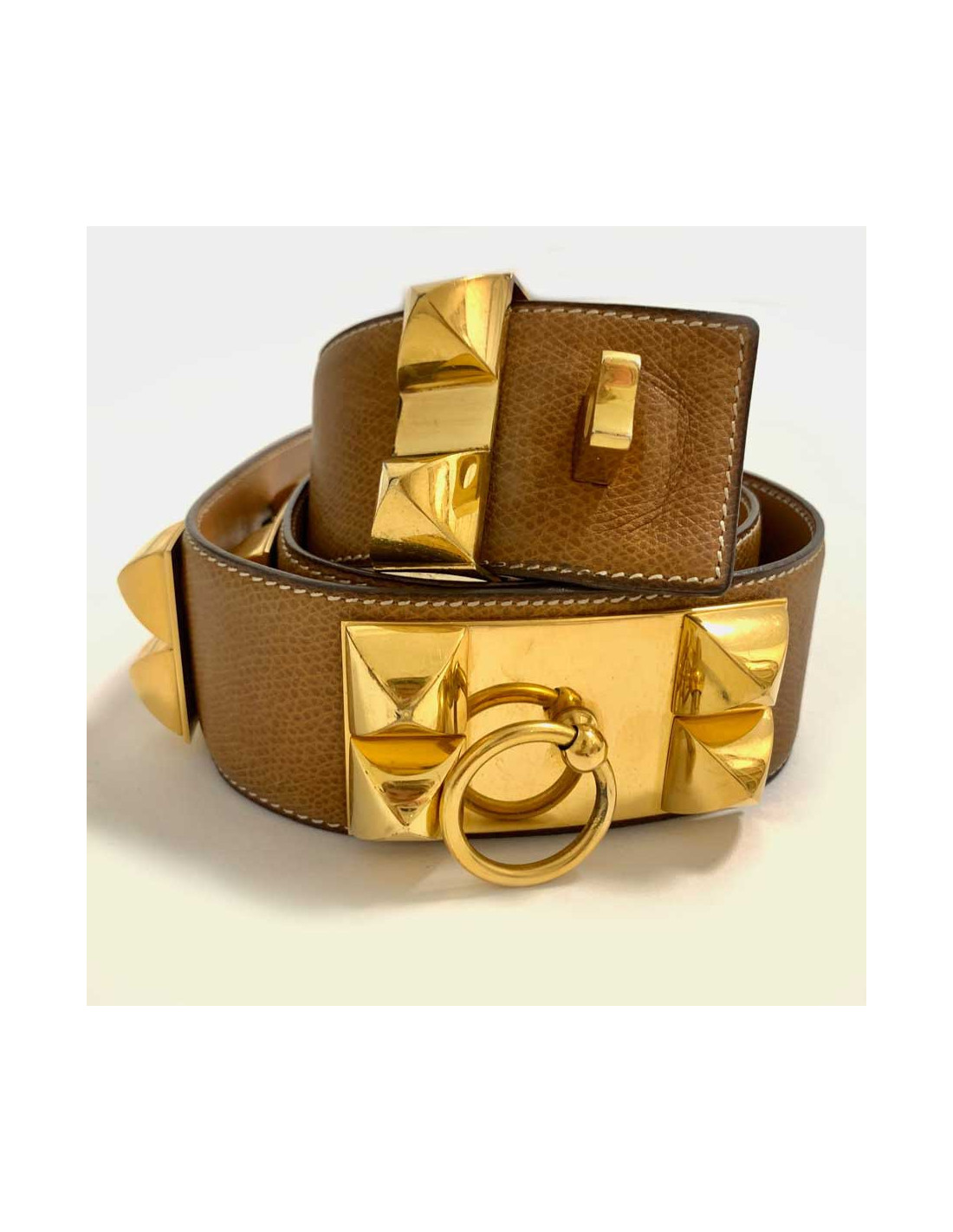 Ceinture iconique de la Maison HERMES. La Collier de Chien en cuir gold et bijouterie en métal plaqué or. C'est une ceinture de 1978 (lettre H dans un rond). La taille n'est pas précisée mais correspond environ à une taille 75.
