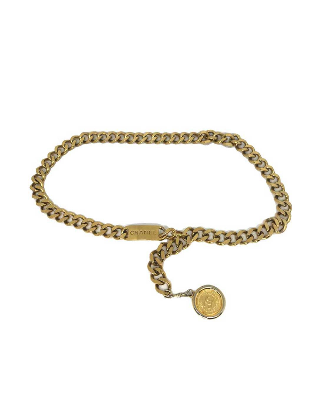 Très belle ceinture CHANEL vintage, chaine en métal doré se terminant par une médaille avec pour inscription "CC CHANEL 31 rue Cambon Paris ».