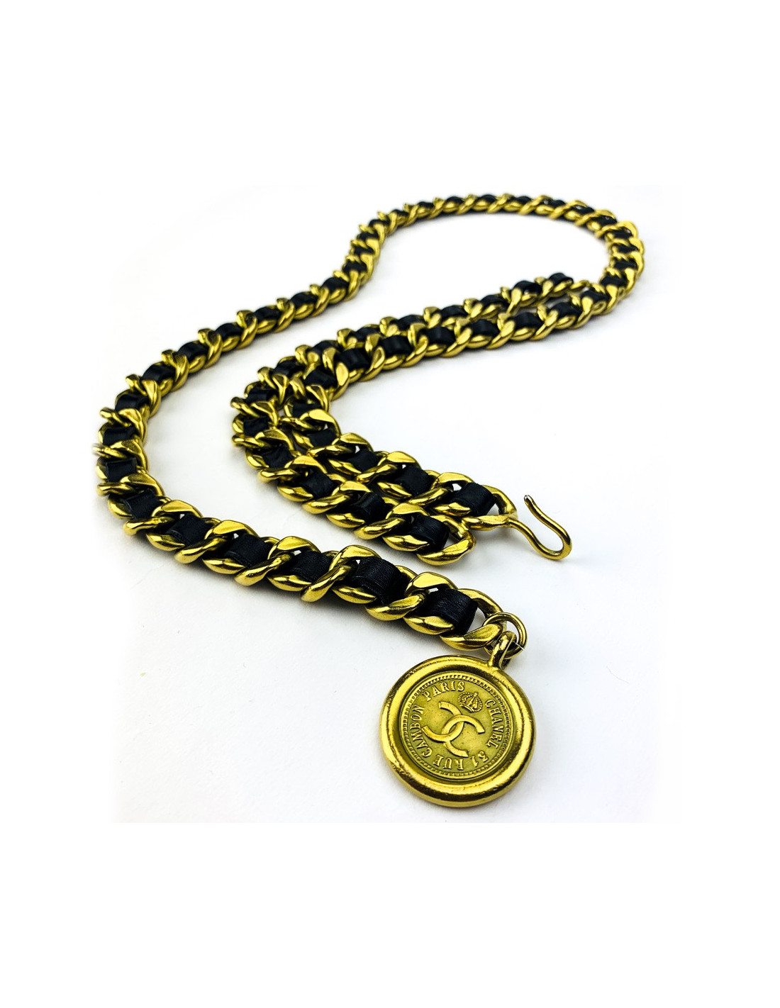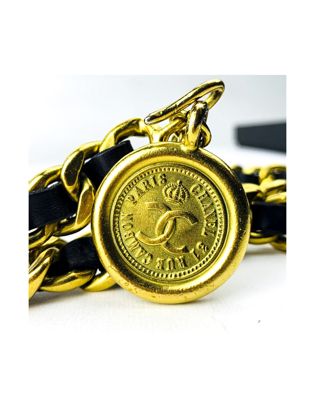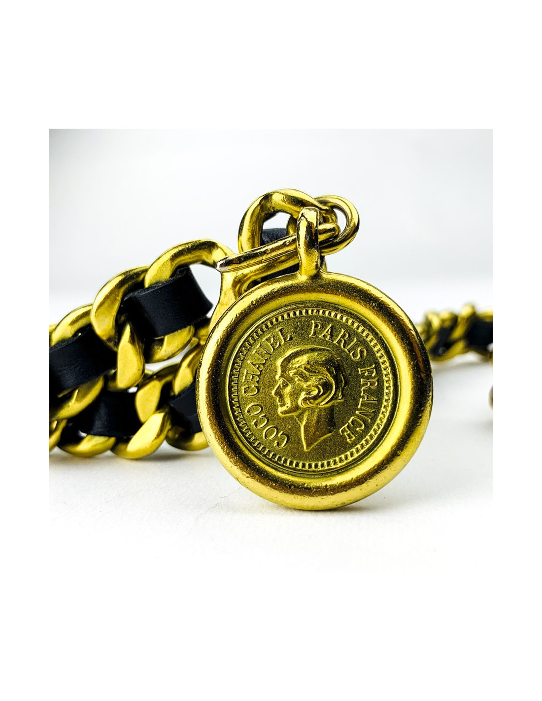 La ceinture est un modèle vintage des années 80. Elle représente la classique chaîne dorée entremêlée de cuir noir si chère à la Maison. La ceinture se termine par la traditionnelle pièce comportant l'inscription: COCO CHANEL PARIS FRANCE sur un côté, et la mention: CHANEL 31 RUE CAMBON PARIS, de l'autre.