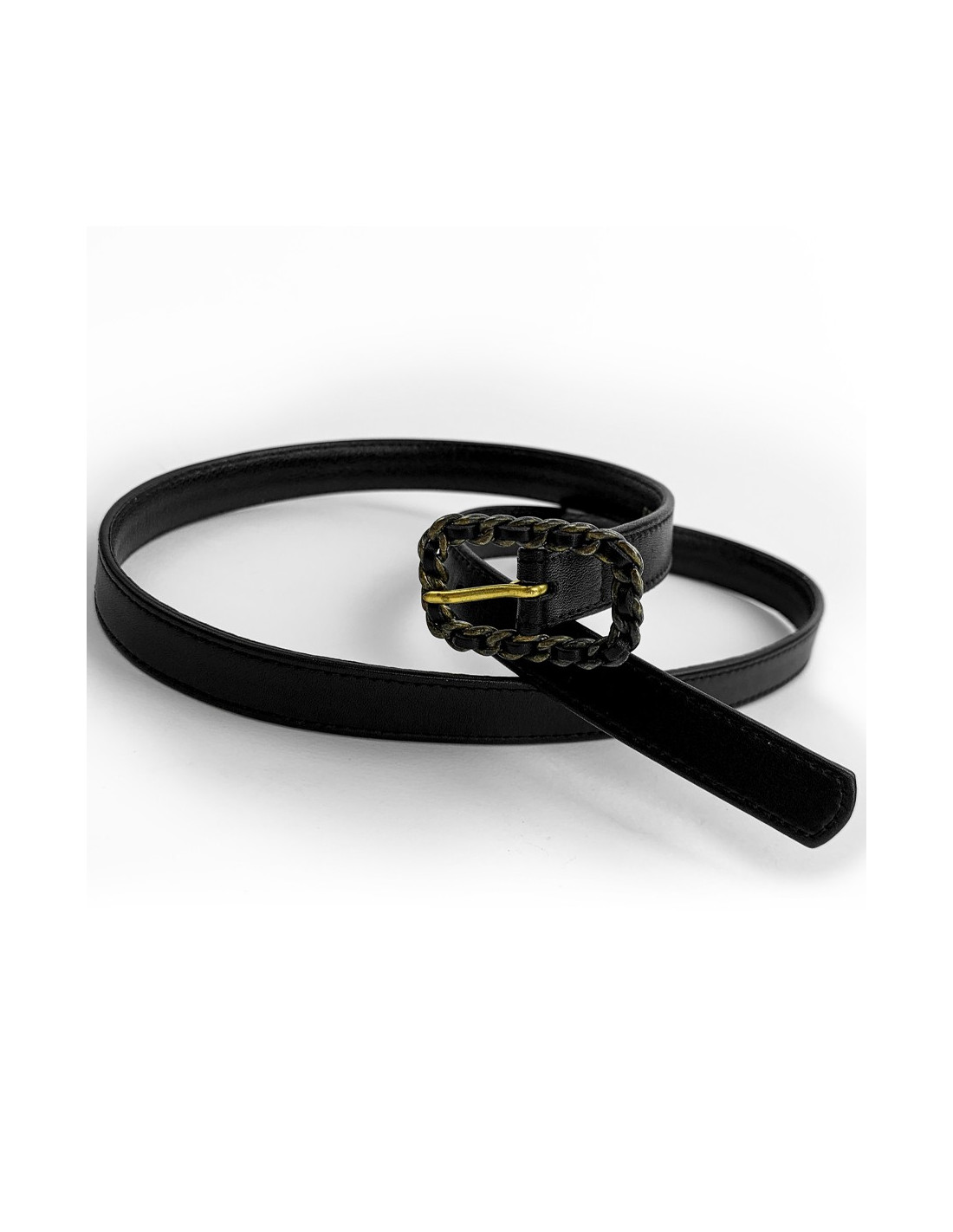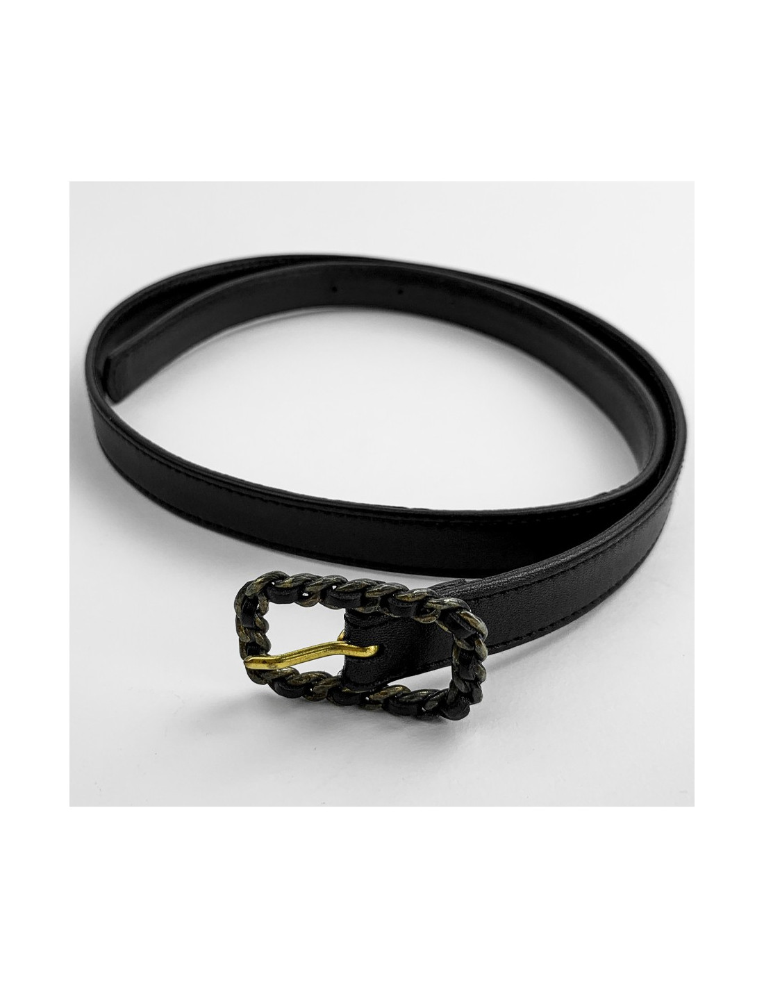 La ceinture est de la Maison Chanel. Elle est en cuir noir avec la boucle de forme rectangulaire en métal doré vieilli et entrelacée de cuir noir.