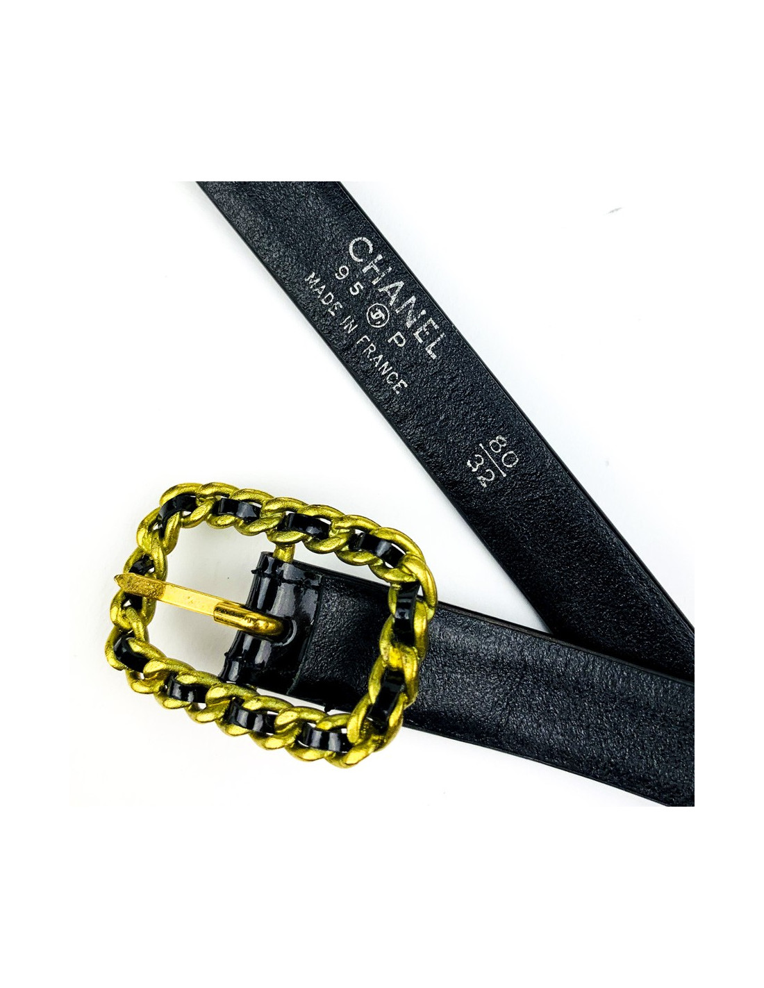 Cette ceinture est issue de la collection Chanel Printemps/Été 1995, c’est une très belle pièce vintage. Elle porte la mention Made in France et la taille 80 /32 y est inscrit à l’intérieur.