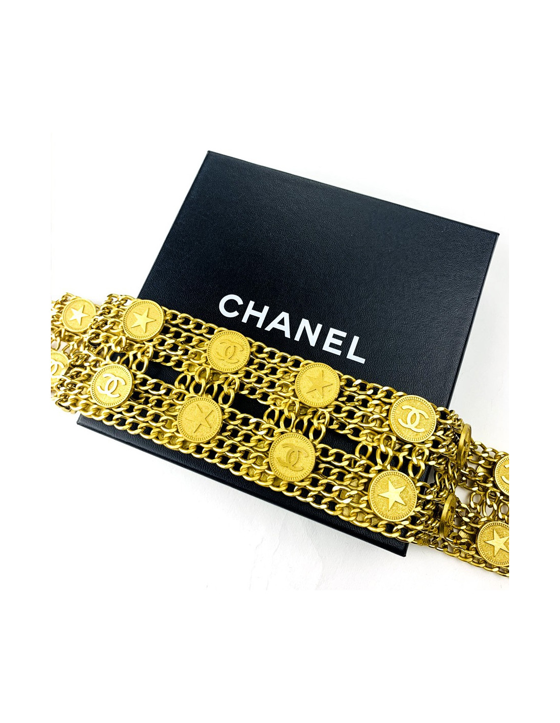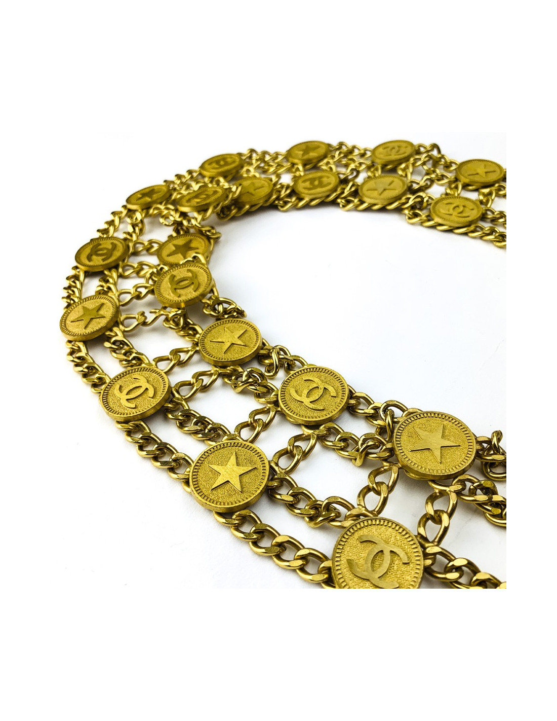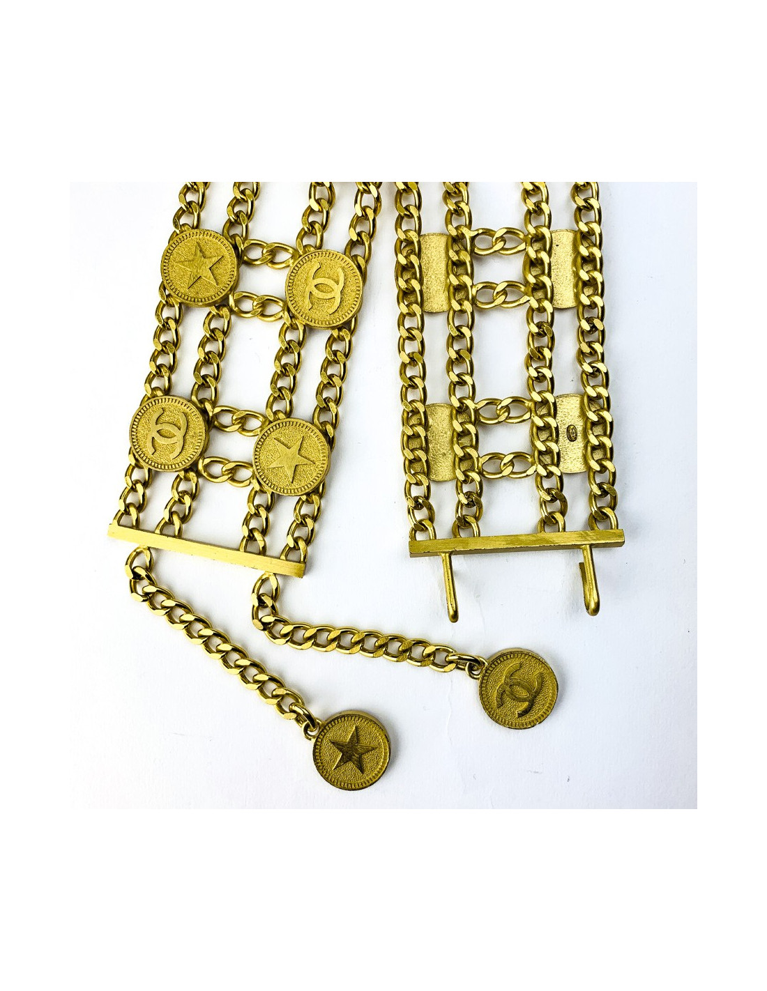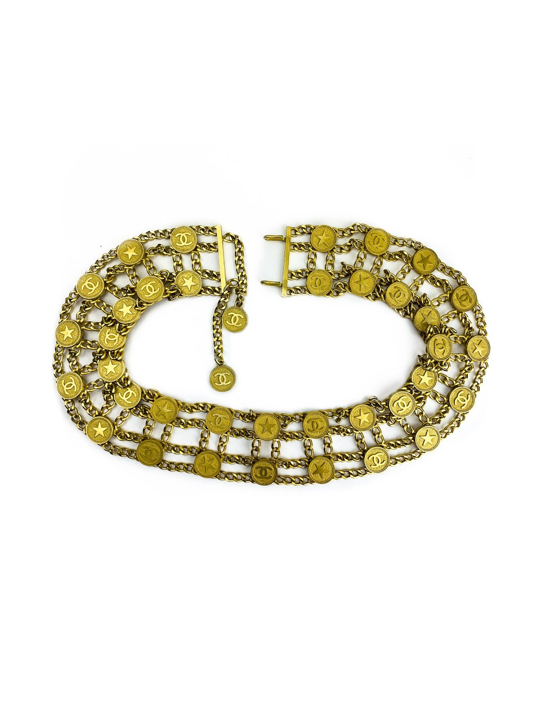 La ceinture est signée CHANEL de la Collection Printemps/Eté 2001. Elle se compose d'une double rangée de pièces tantôt faisant figurer un CC, tantôt une étoile. Elle se termine au niveau du fermoir par une double chaîne, l'une faisant pendre un CC, l'autre une étoile.