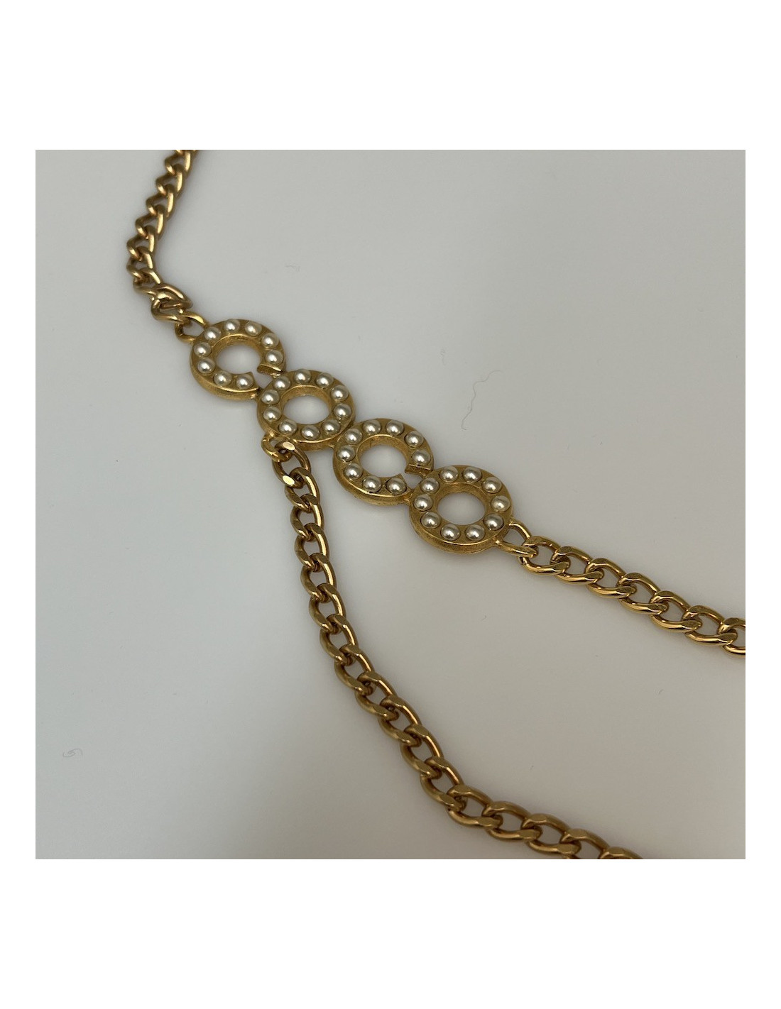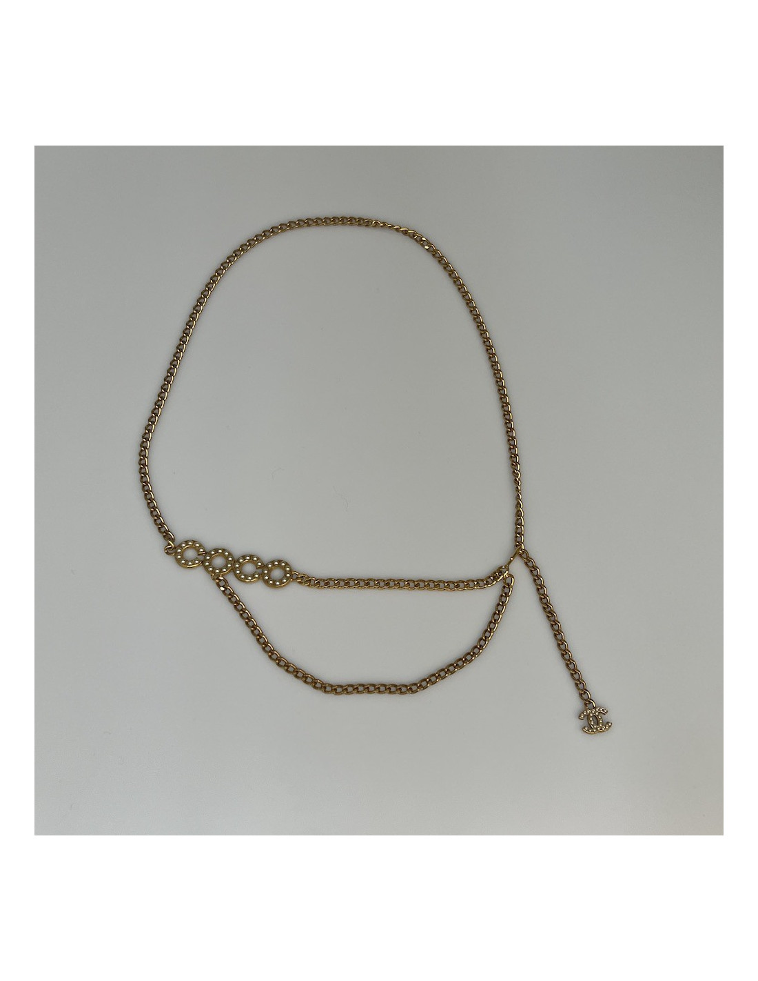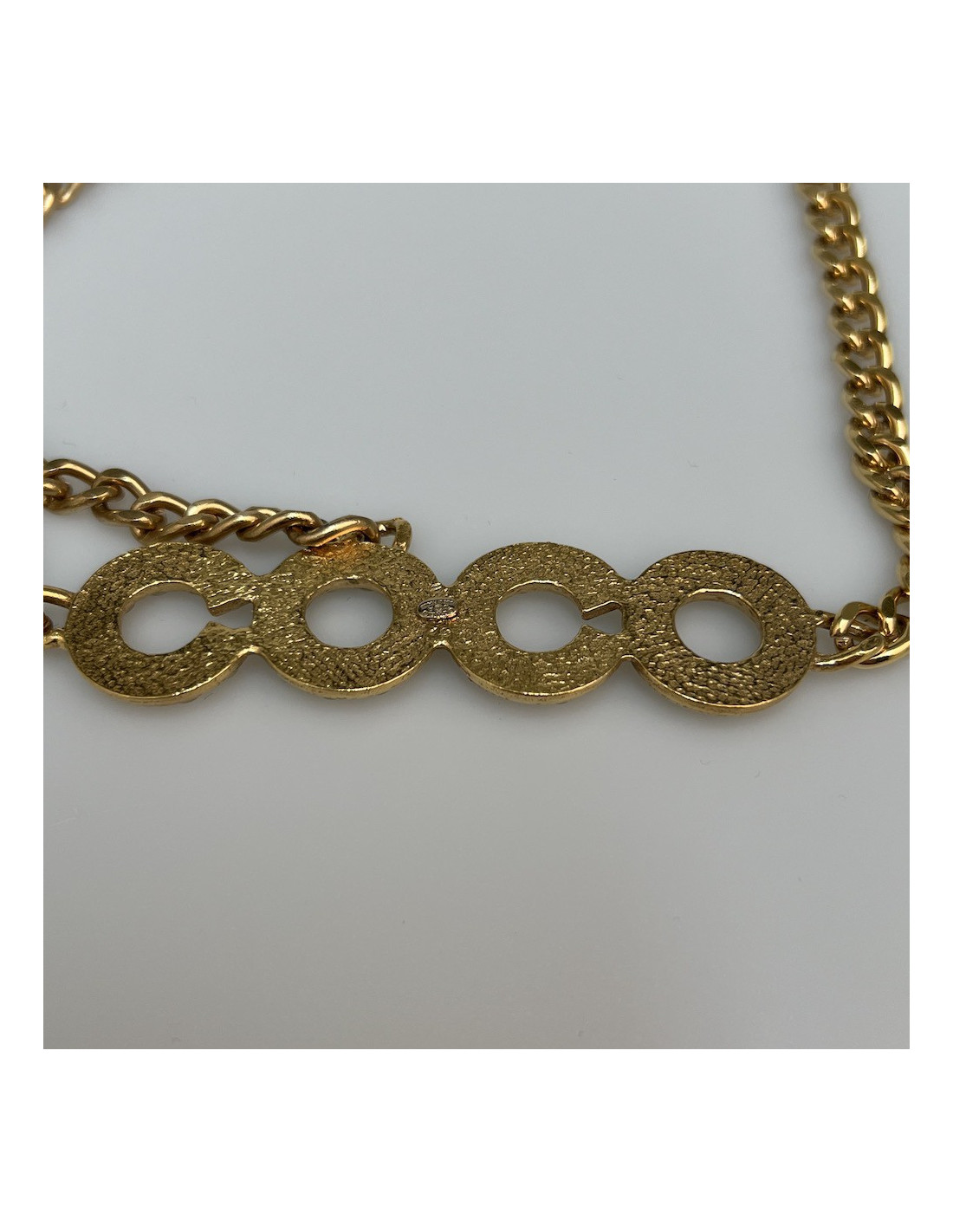 La ceinture est signée CHANEL. C'est une longue chaîne en métal doré se terminant par une double chaîne. La ceinture porte l'inscription COCO sertie de perles nacrées.