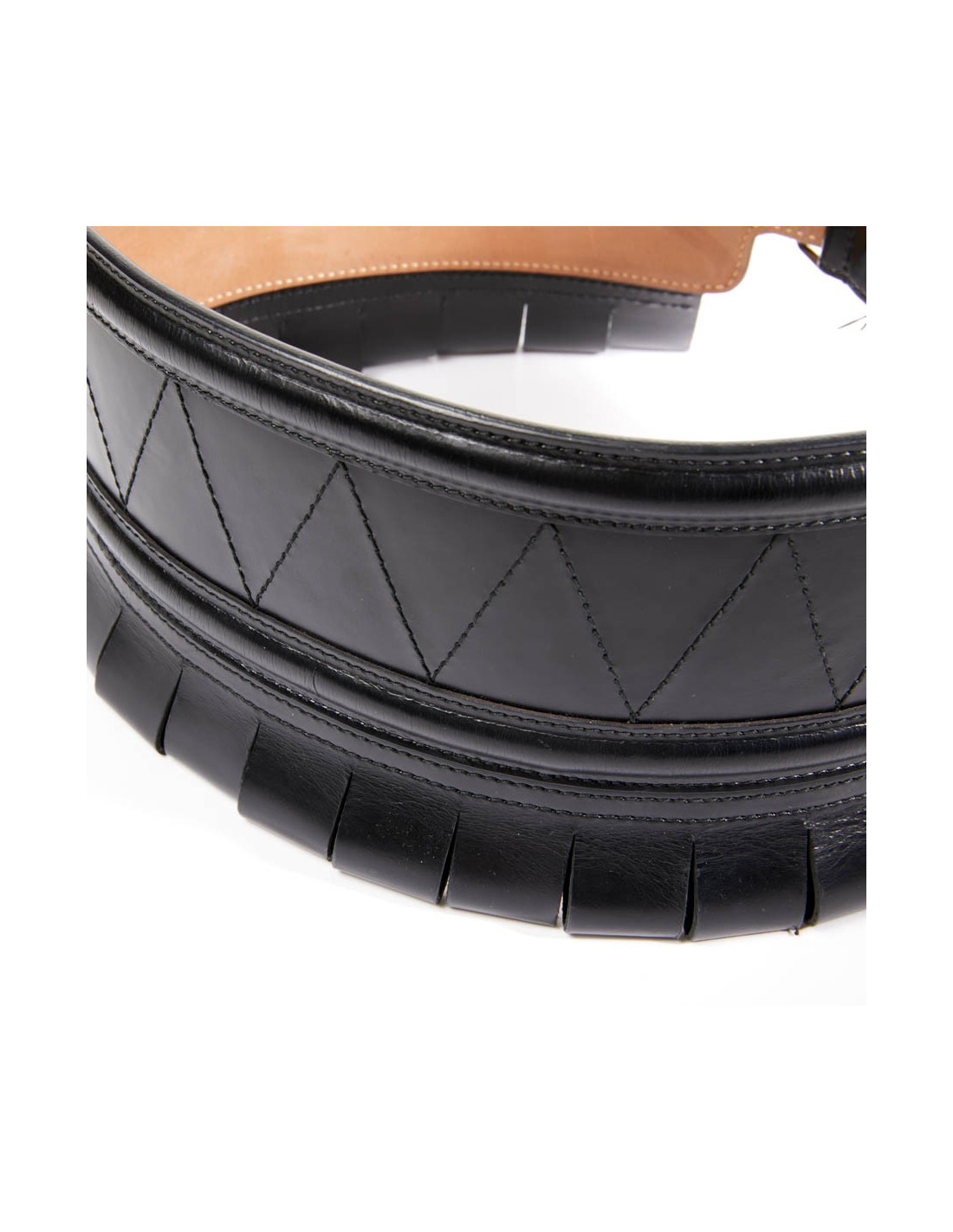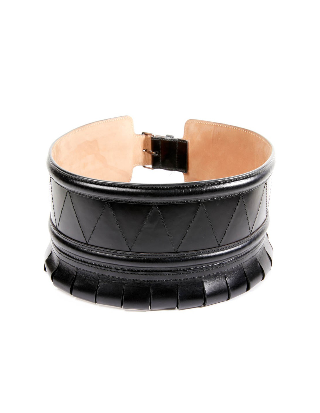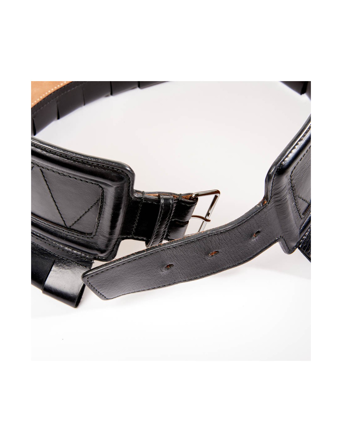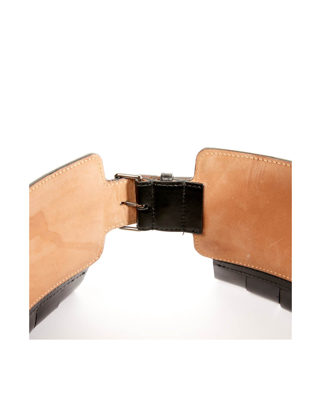 Large ceinture qui accentuera votre taille fine, comme un corset. La bijouterie est en métal argent noirci. Le cuir est du veau box noir rigide. Elle est doublée en cuir beige.