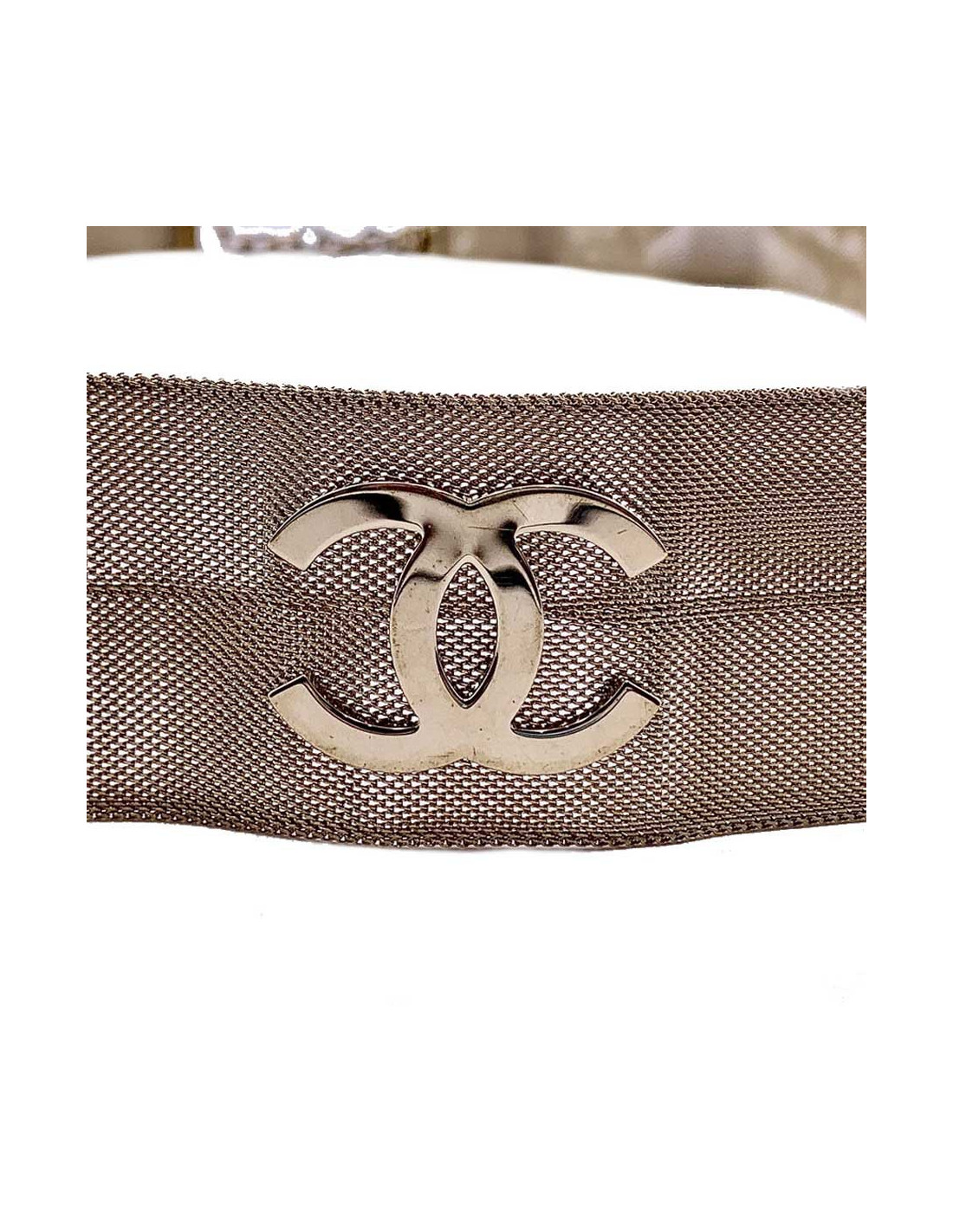 Ceinture CHANEL en tissu métallique doré avec en son centre l'incontournable CC. Un mousqueton ferme la ceinture.
