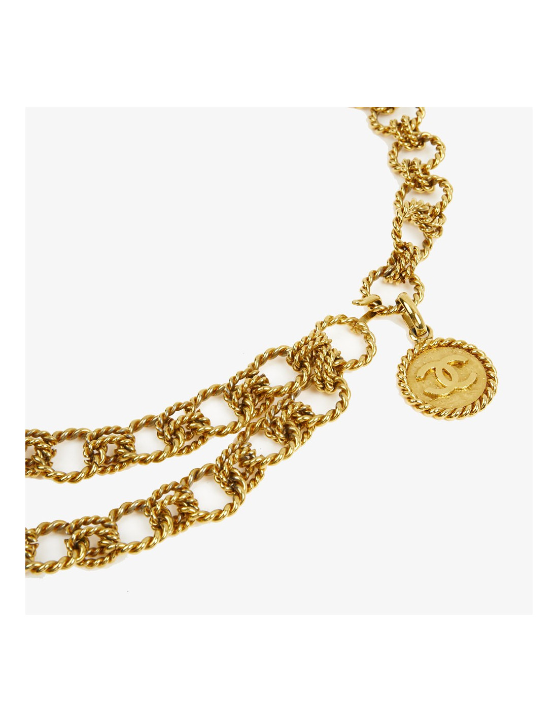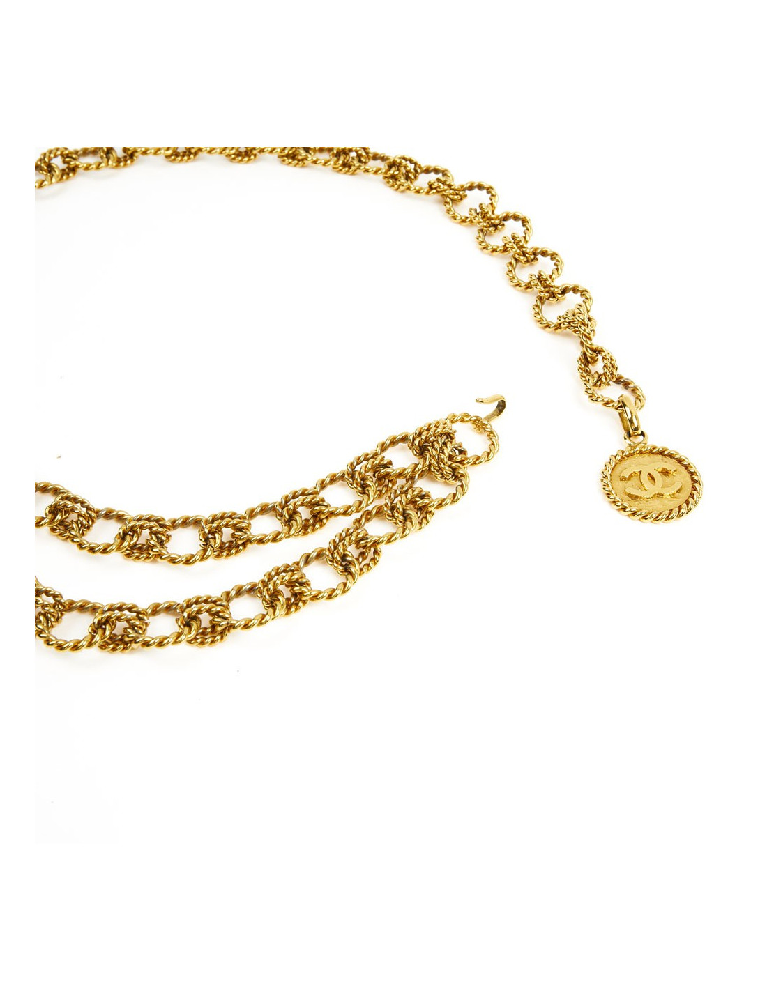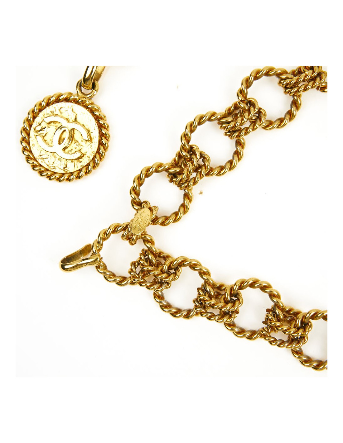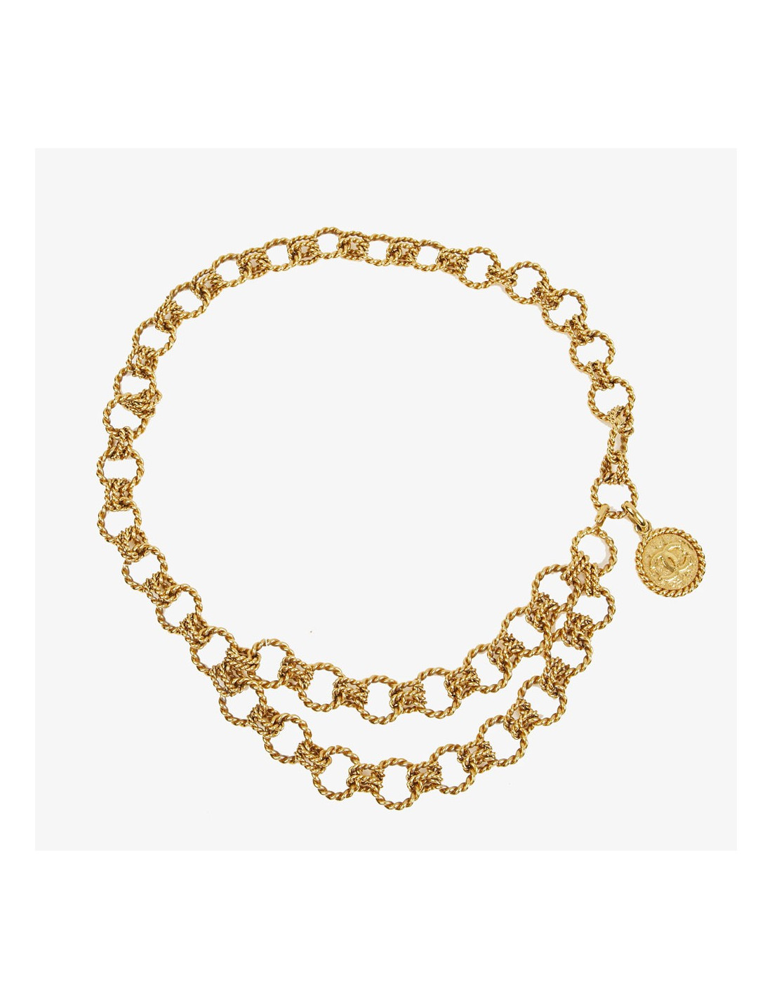 Imposante ceinture vintage de la Maison Chanel, composée d’anneaux tressés dorés. Elle est en très bon état.