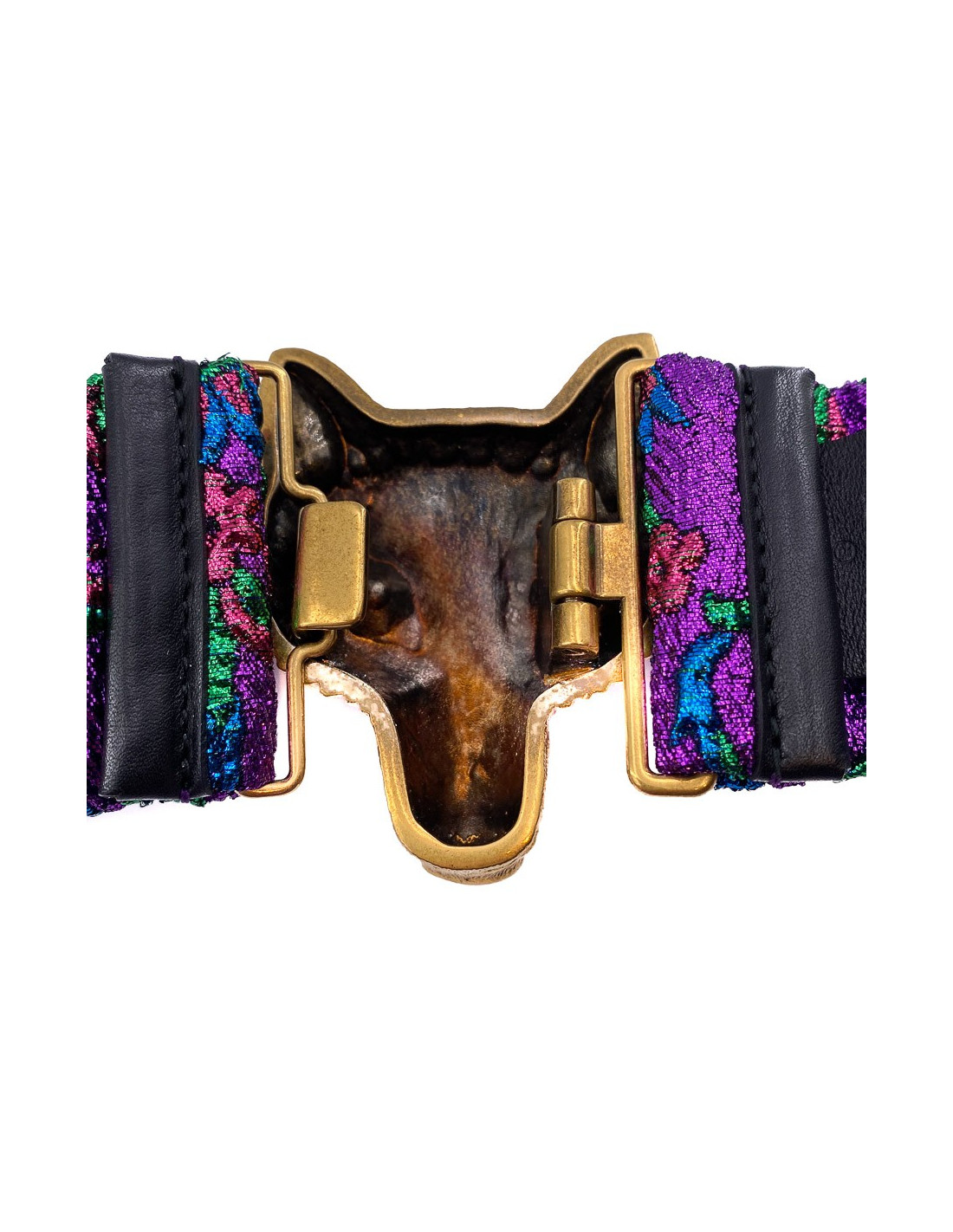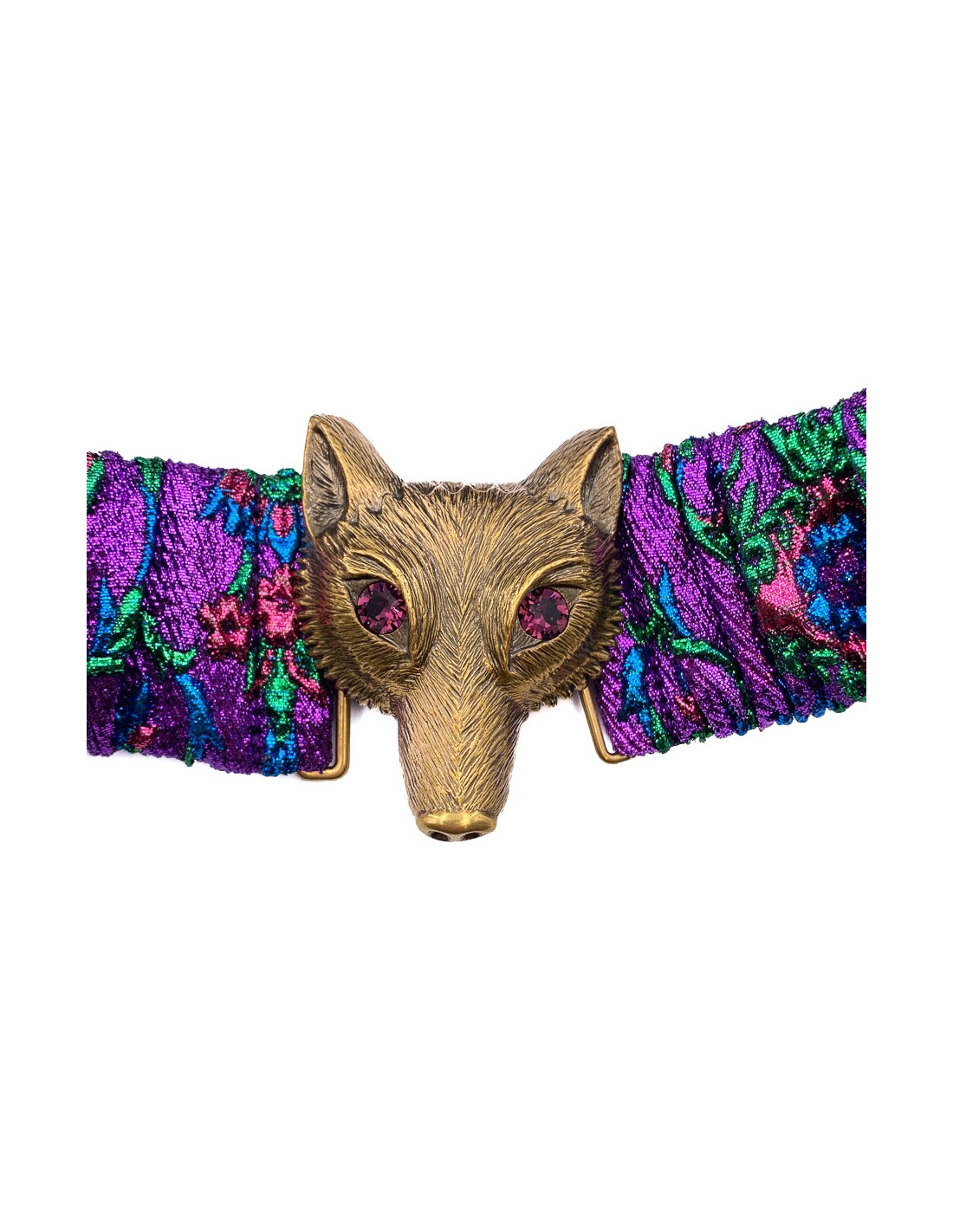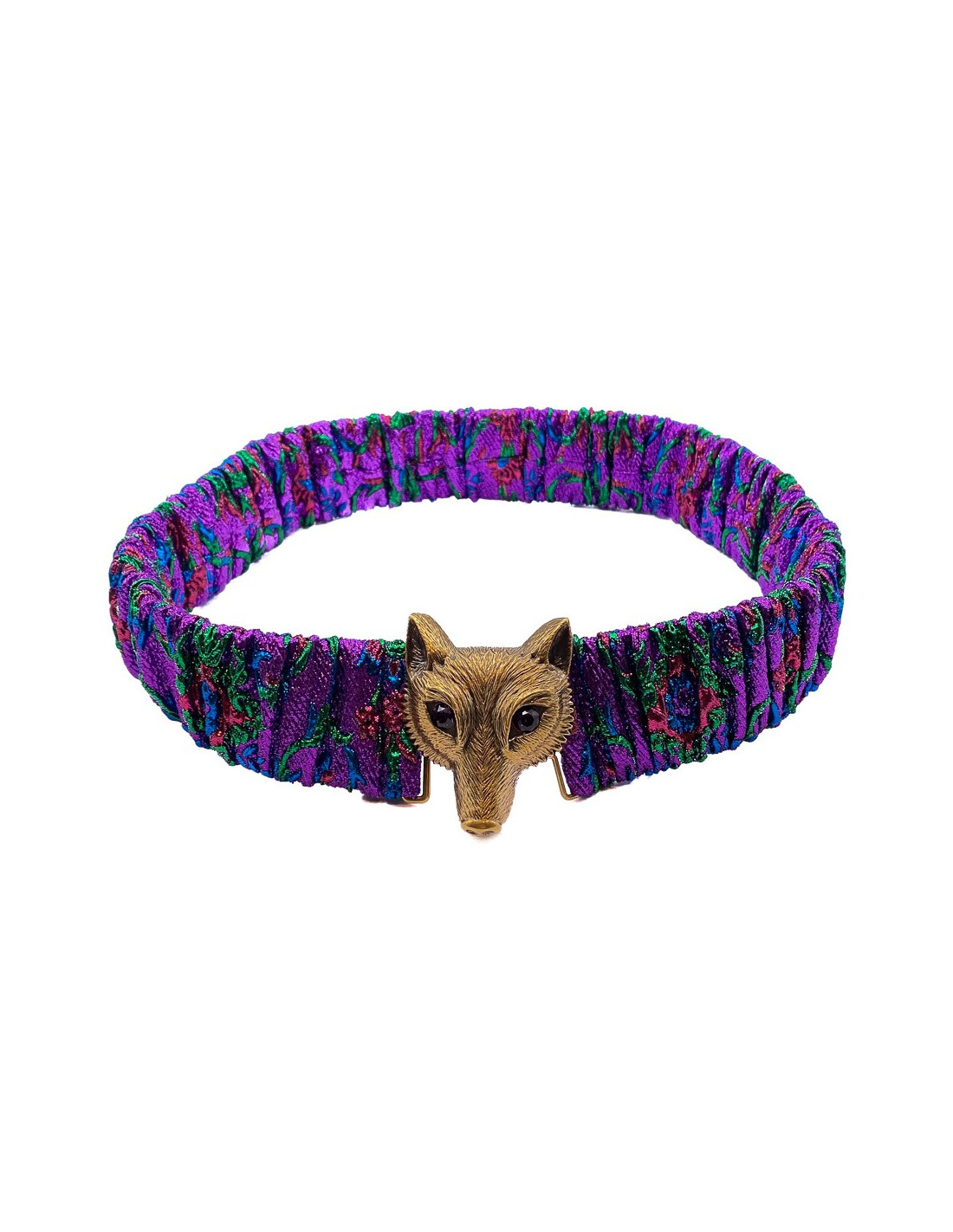 La ceinture est de la Maison GUCCI. Fort originale, elle se compose d'un élastique habillé sur tout son tour de taille de tissu crépon dans les tons de rose, rouge, vert et bleu. Enfin, elle vient s'attacher via un crochet à tête de loup dorée aux yeux de strass roses. Osez la couleur !