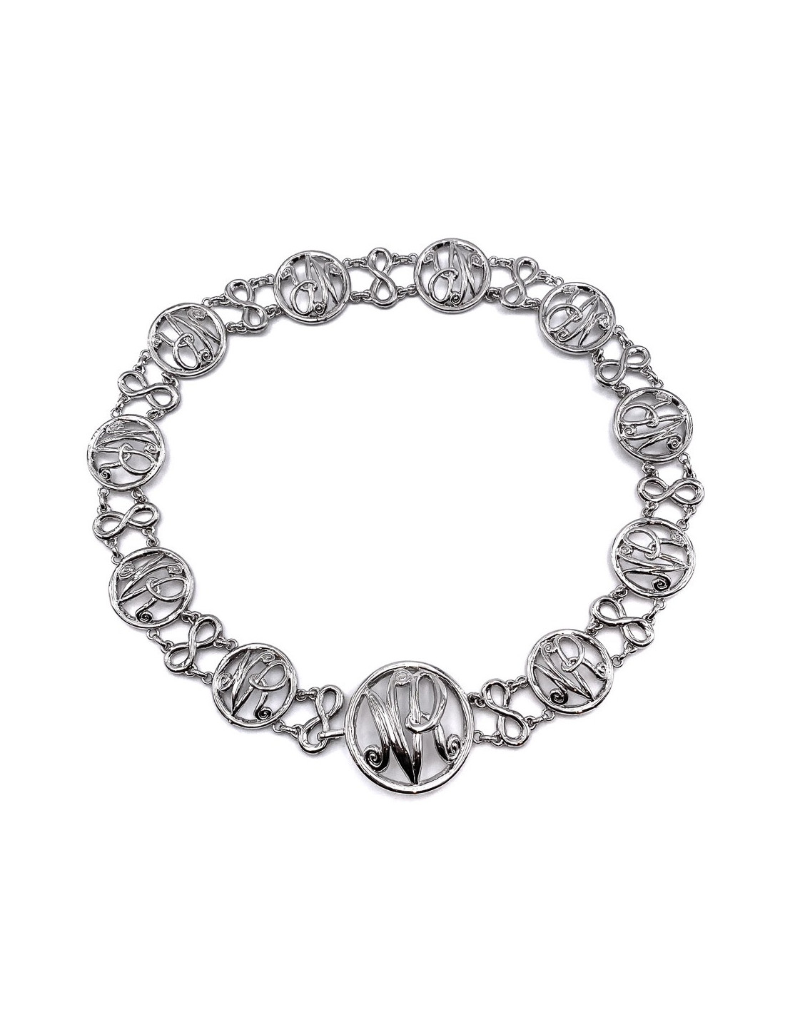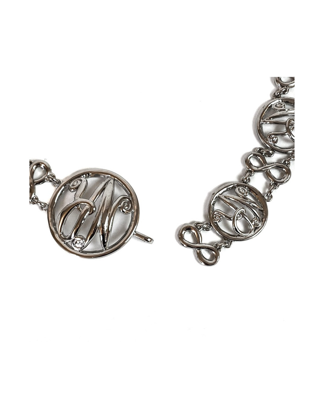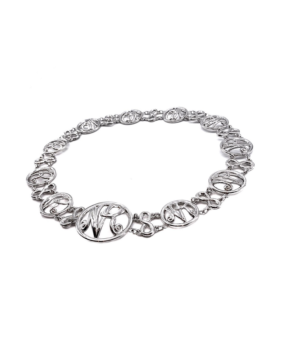 La ceinture est de la Maison NINA RICCI. Elle se compose d'une succession de cercles en métal argenté comportant les initiales de la marque NR. Elle se ferme par un crochet. Elle soulignera votre taille avec élégance.