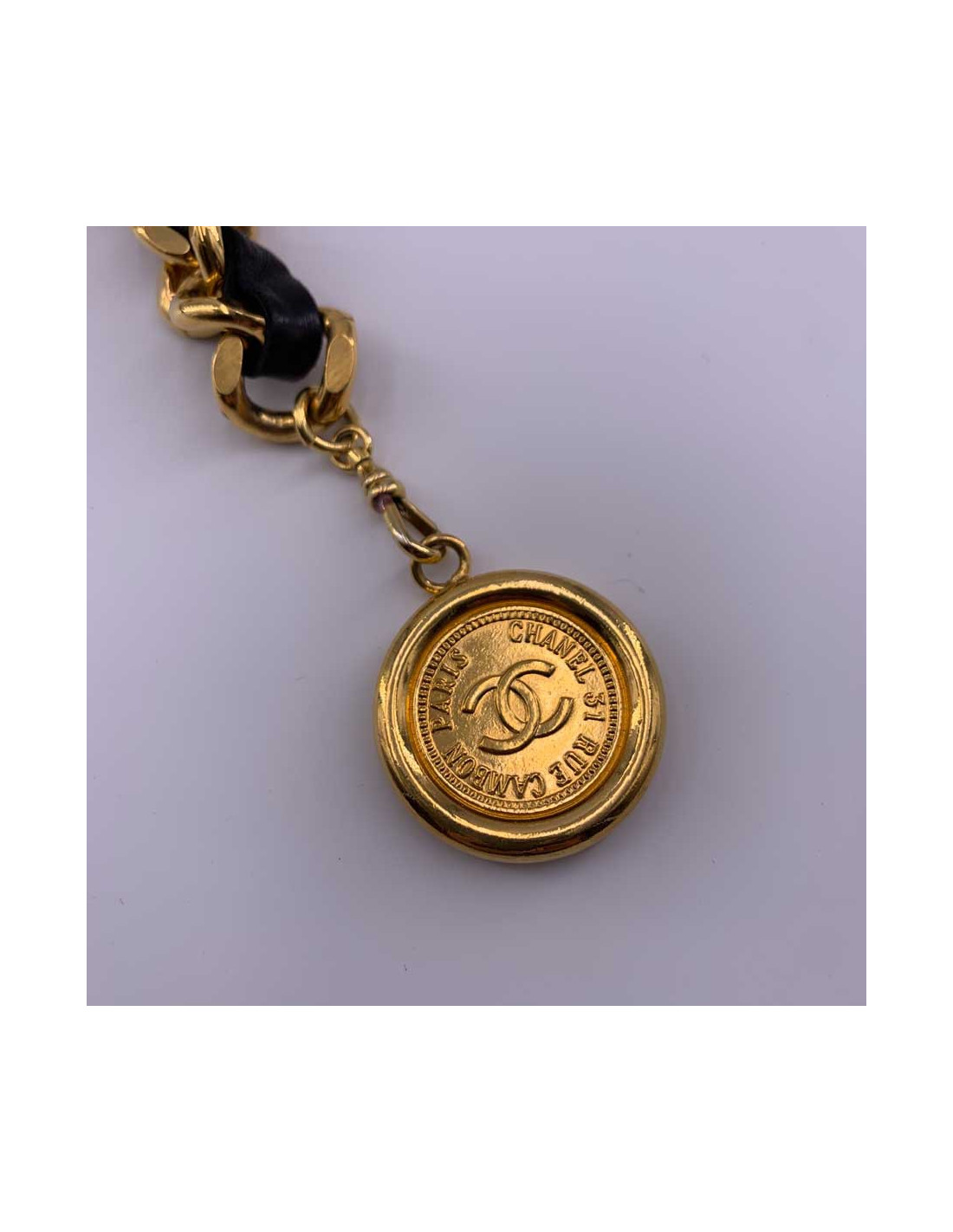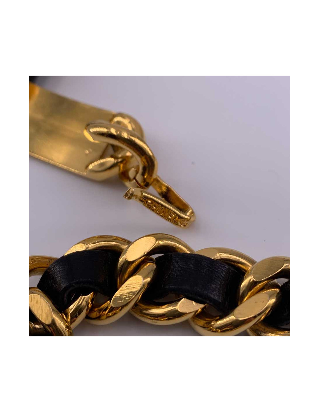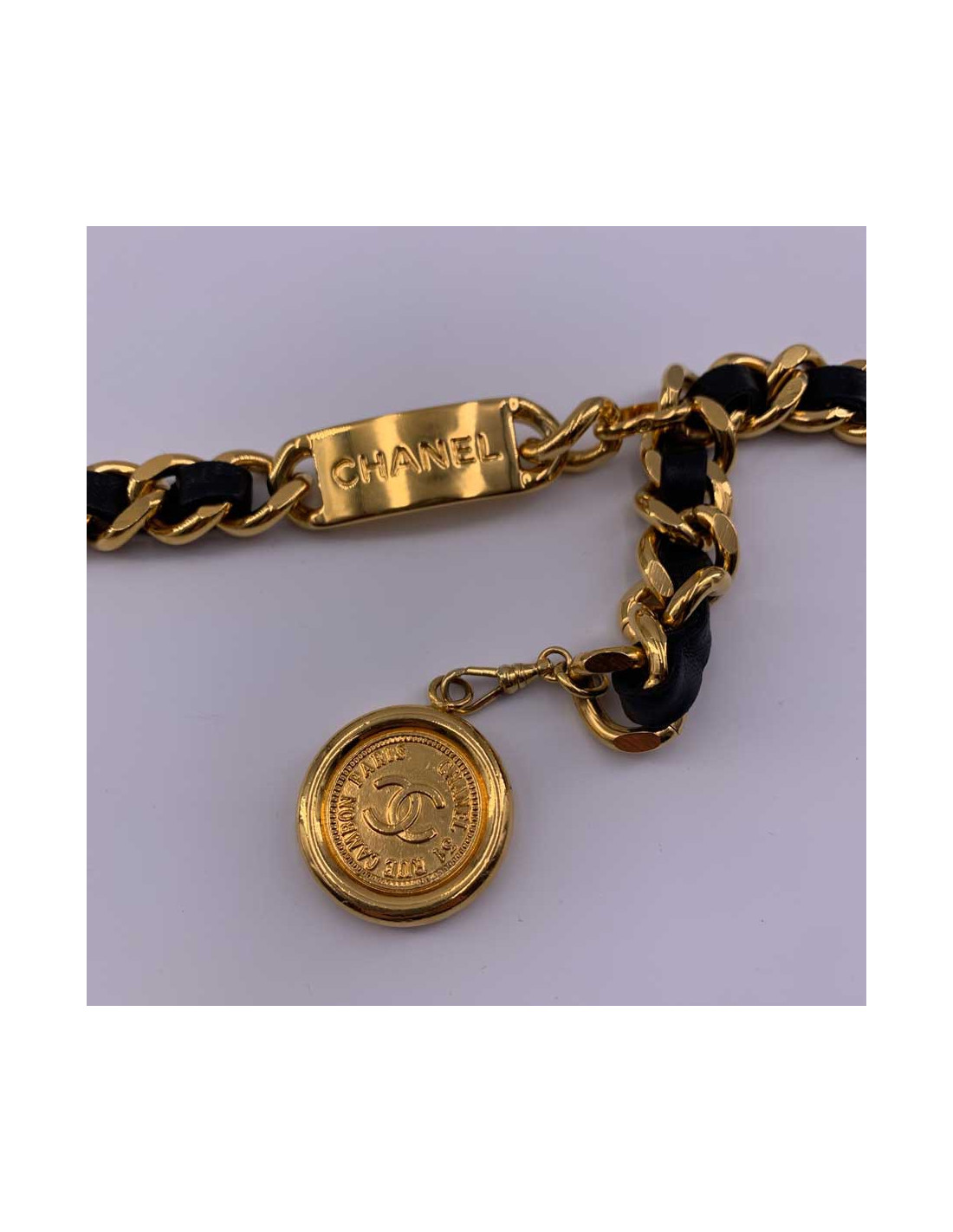 Pièce vintage de la Maison CHANEL. L'esprit de la marque se retrouve dans cette ceinture dont le succès et l'intemporalité n'est plus à prouver. Un entrelacement de chaîne dorée et de cuir noir se finissant d'une part par une plaque rectangulaire avec la marque CHANEl gravée dans le métal, et d'autre part par une pièce au centre de laquelle se trouve le traditionnel CC encerclé de la mention CHANEL 31 RUE CAMBON PARIS.
