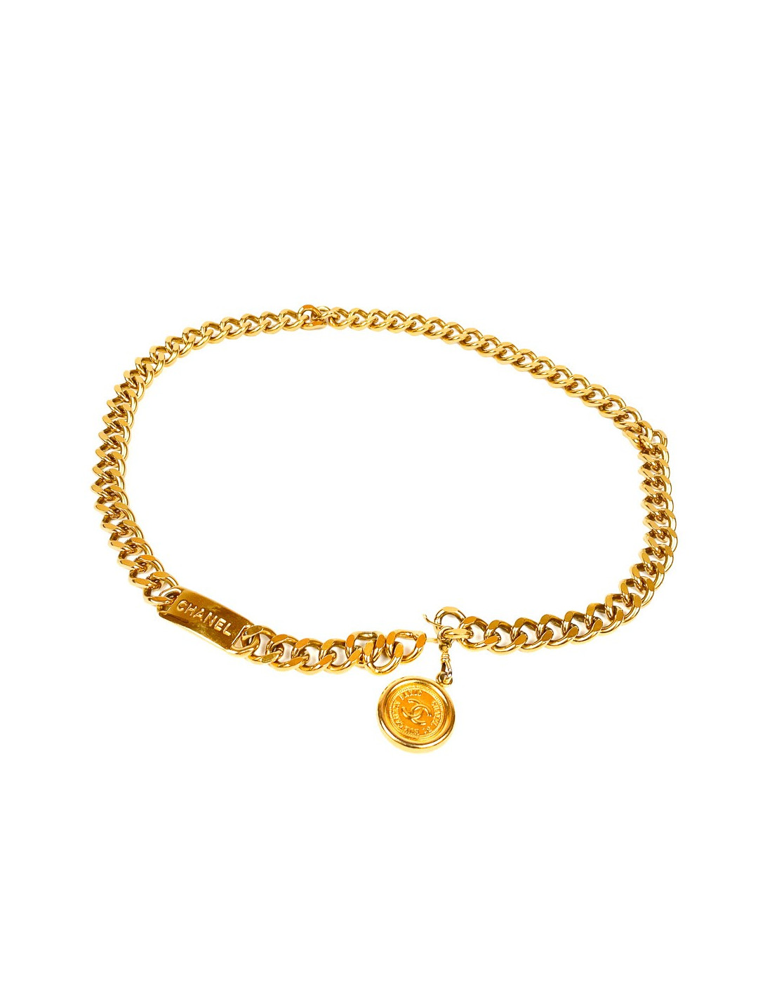 La ceinture est une pièce vintage de la Maison CHANEL. Modèle incontournable de la marque, elle se présente sous la forme d'u!ne chaîne dorée à l'or fin avec d'un côté la plaque CHANEL et de l'autre la pièce pendante CC CHANEL 31 RUE CAMBON PARIS.