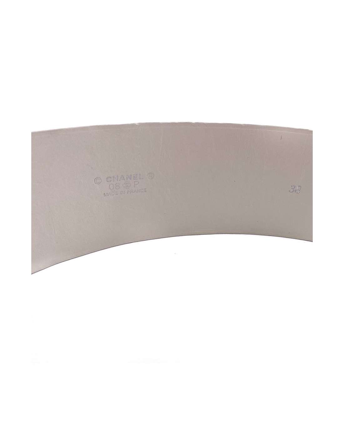 La ceinture est dans un très bon état général. Nous percevons qu'elle a déjà été utilisé au regard des plis dans le cuir. Une ombre à peine perceptible est présente (cf photo). Ceci étant, il n'y a aucun défaut de structure et l'élément central en pâte de verre est dans un état impeccable. La ceinture correspond à une taille 38. 73 centimètres de longueur au premier trou, 77 centimètres de longueur au second. Sa largeur est de 6 centimètres. Présence de la marque CHANEL à l'intérieur indiquant qu'elle est issue de la Collection Printemps/Été 2008 et qu'elle est Made In France.