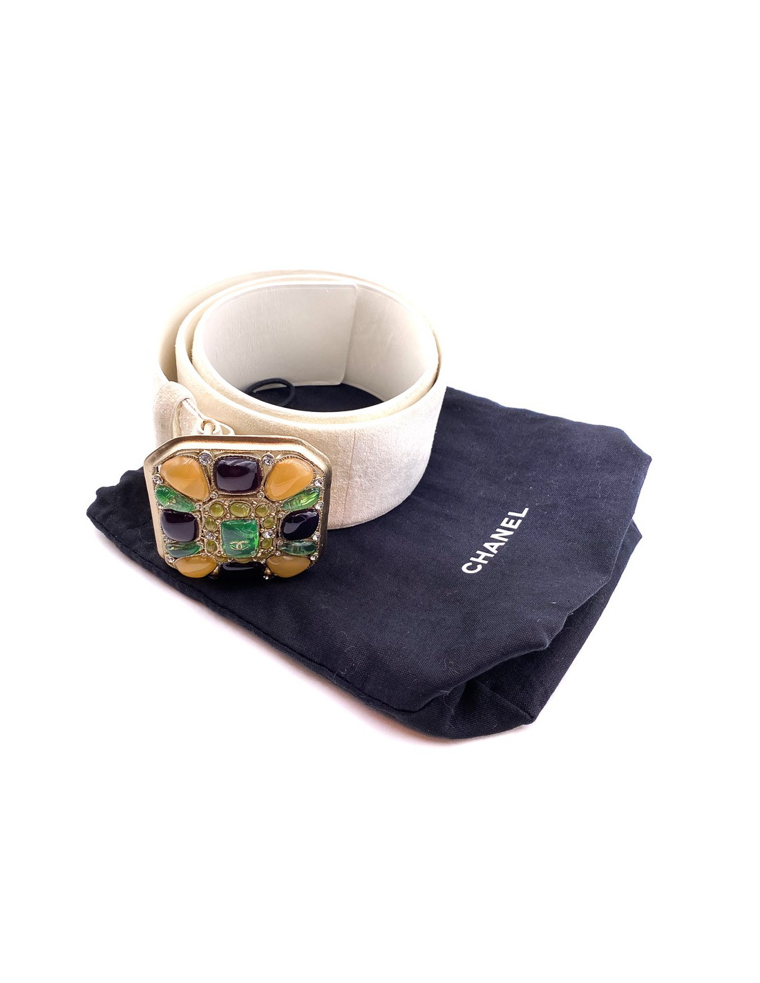 La ceinture est une pièce de la Maison CHANEL. Une large langue de cuir beige avec un carré de cabochons multicolores au niveau de la boucle, ce qui lui donne un look très couture.