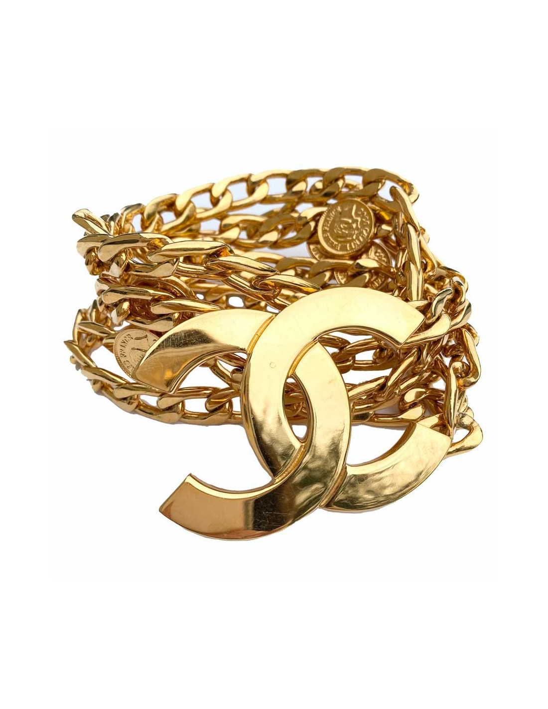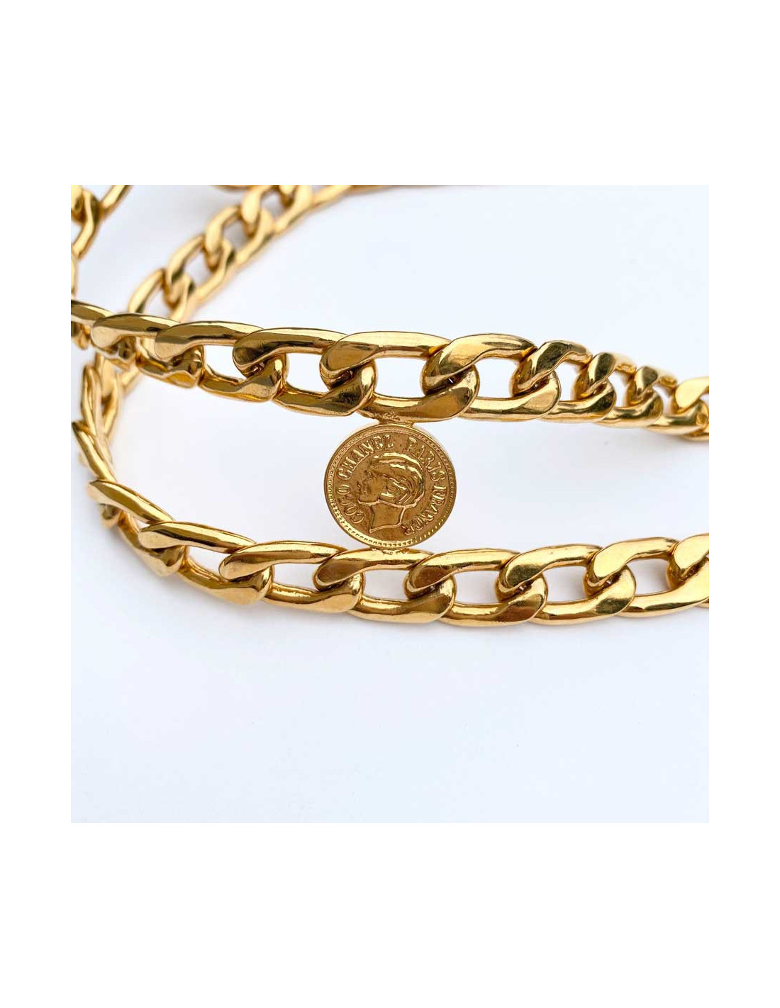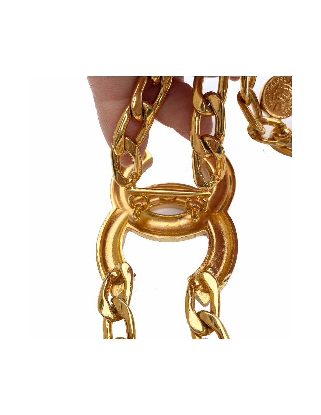 Sublime ceinture Chanel vintage datant de la collection Chanel Printemps/Été 1997. Vogue nous l’a emprunté pour un shooting paru dans son édition de mars 2020. Cette ceinture est collector, vous pouvez y voir des pièces ou médailles faisant la jonction de deux chaines, le tout fermé par un gros CC (légèrement rayé). cette ceinture peut se porter sur une chemise blanche XL, sur une robe moulante, à la Coco Chanel sur un pantalon noir large, bref sur tout un tas de tenue. C’est une pièce à ne pas rater.