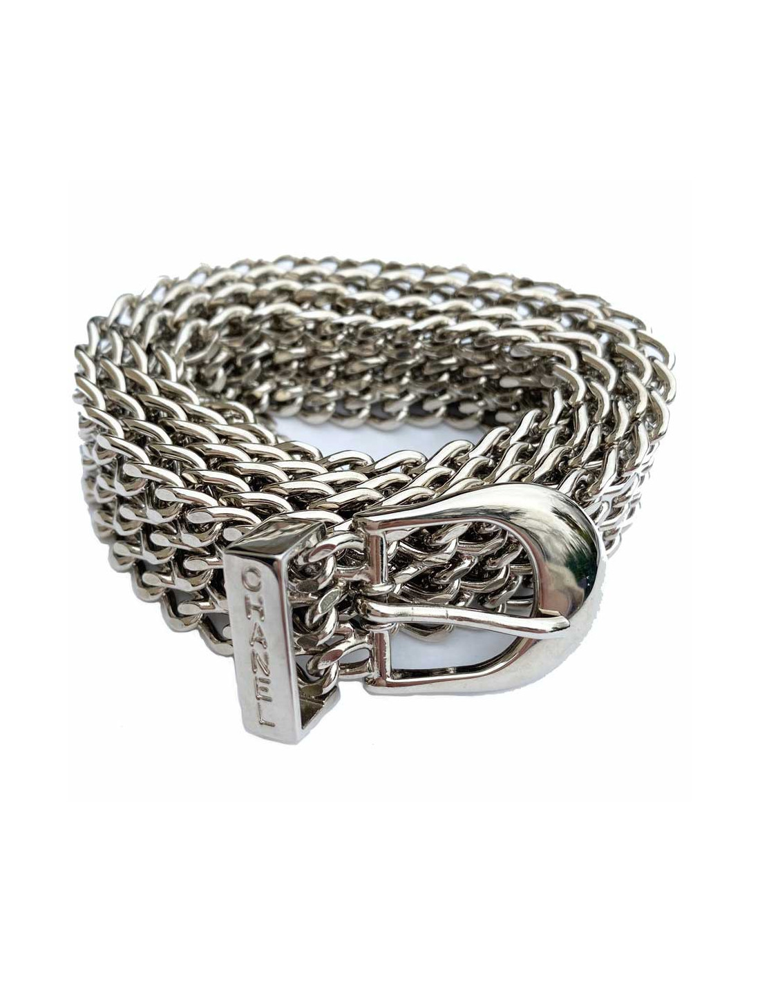 Ravissante ceinture Chanel en métal argenté issue de la collection Chanel Printemps-Été 1997. Cette ceinture convient à n’importe quelle taille en dessous de 85 cm de tour de taille, car ajustable dans la maille en métal, il n’y a pas de trous de ceinture.