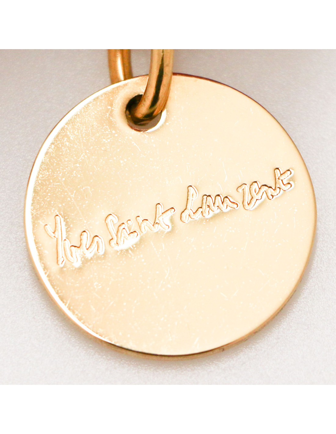 Détails : petit pendentif en métal doré au niveau de la boucle avec gravures « Love » et signature « Yves Saint Laurent ». Bon état car cuir légèrement craquelé à l’intérieur.