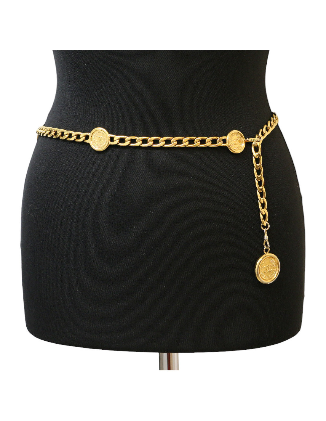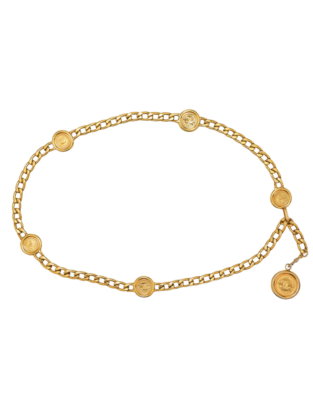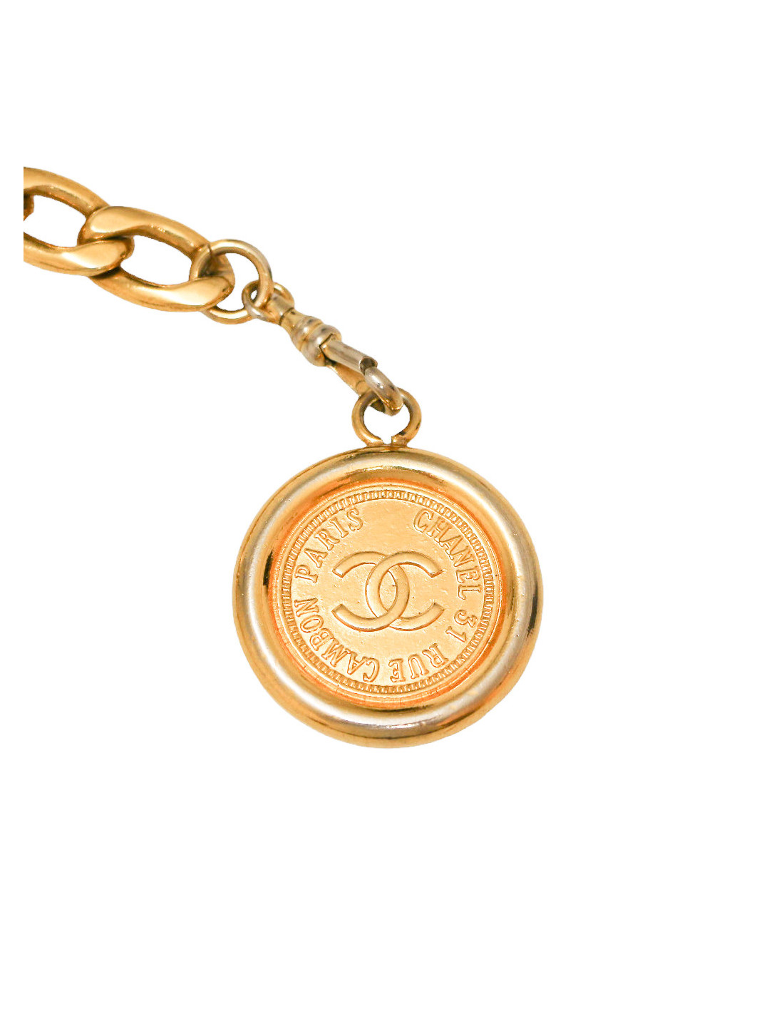 Détails : signature sur le crochet du fermoir, elle est ajustable. Ceinture gourmette avec 5 pièces plus 1 charm's au bout de la chaine, tous siglés "CHANEL 31 RUE CAMBON PARIS".