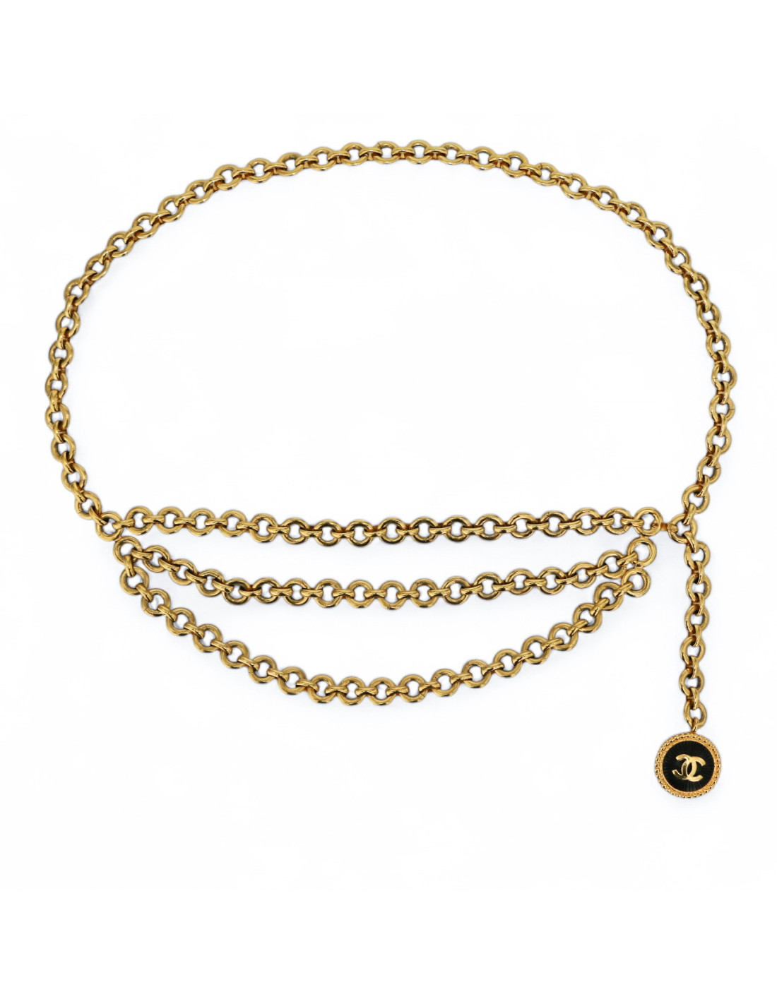Détails : ceinture triple rangs vintage en maille jaseron en métal, au bout un charm's rond CC. Elle est ajustable, fermeture par un crochet.