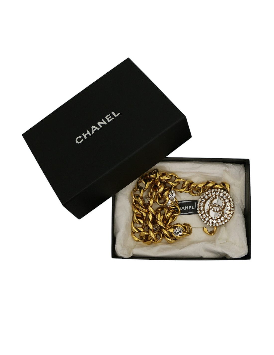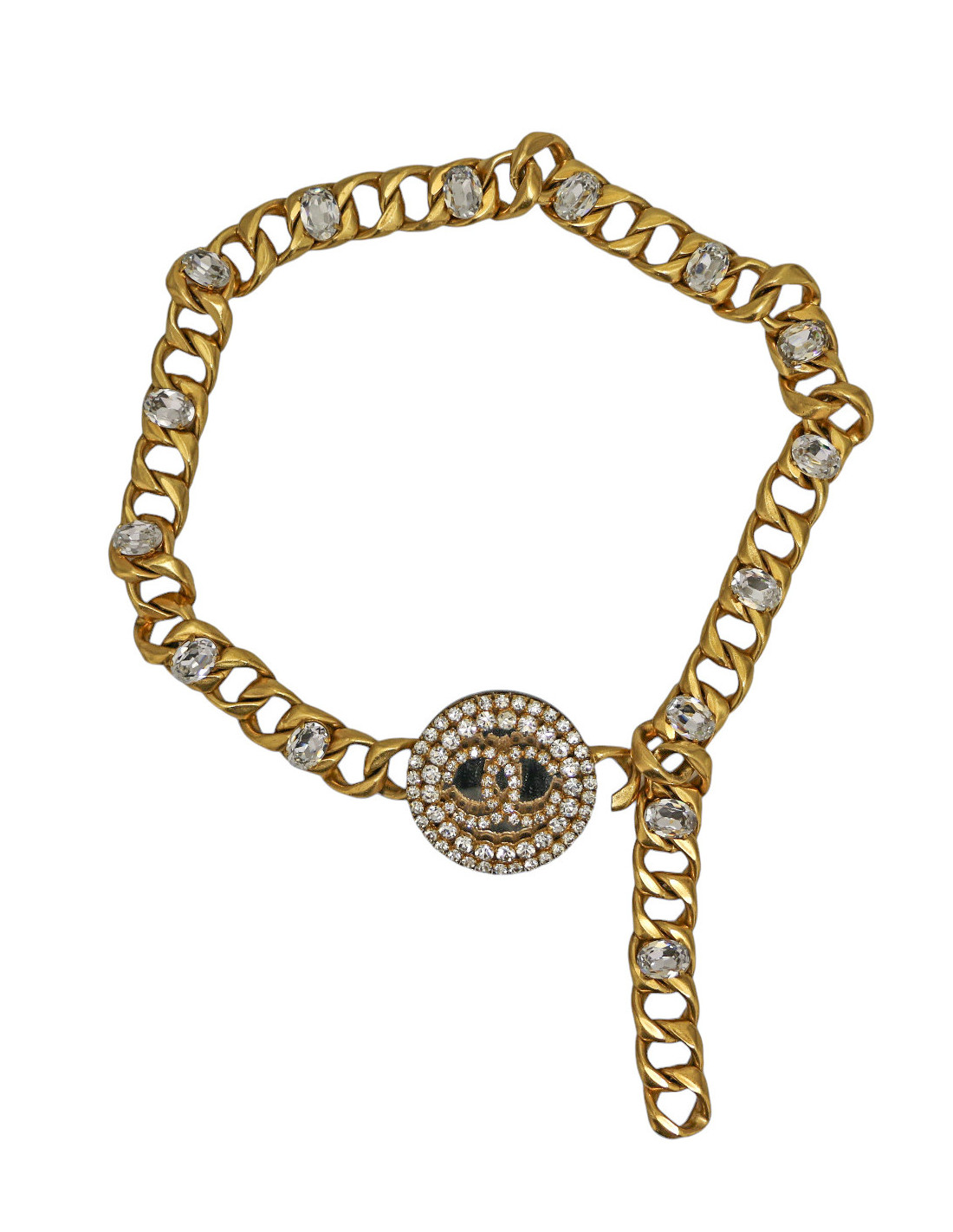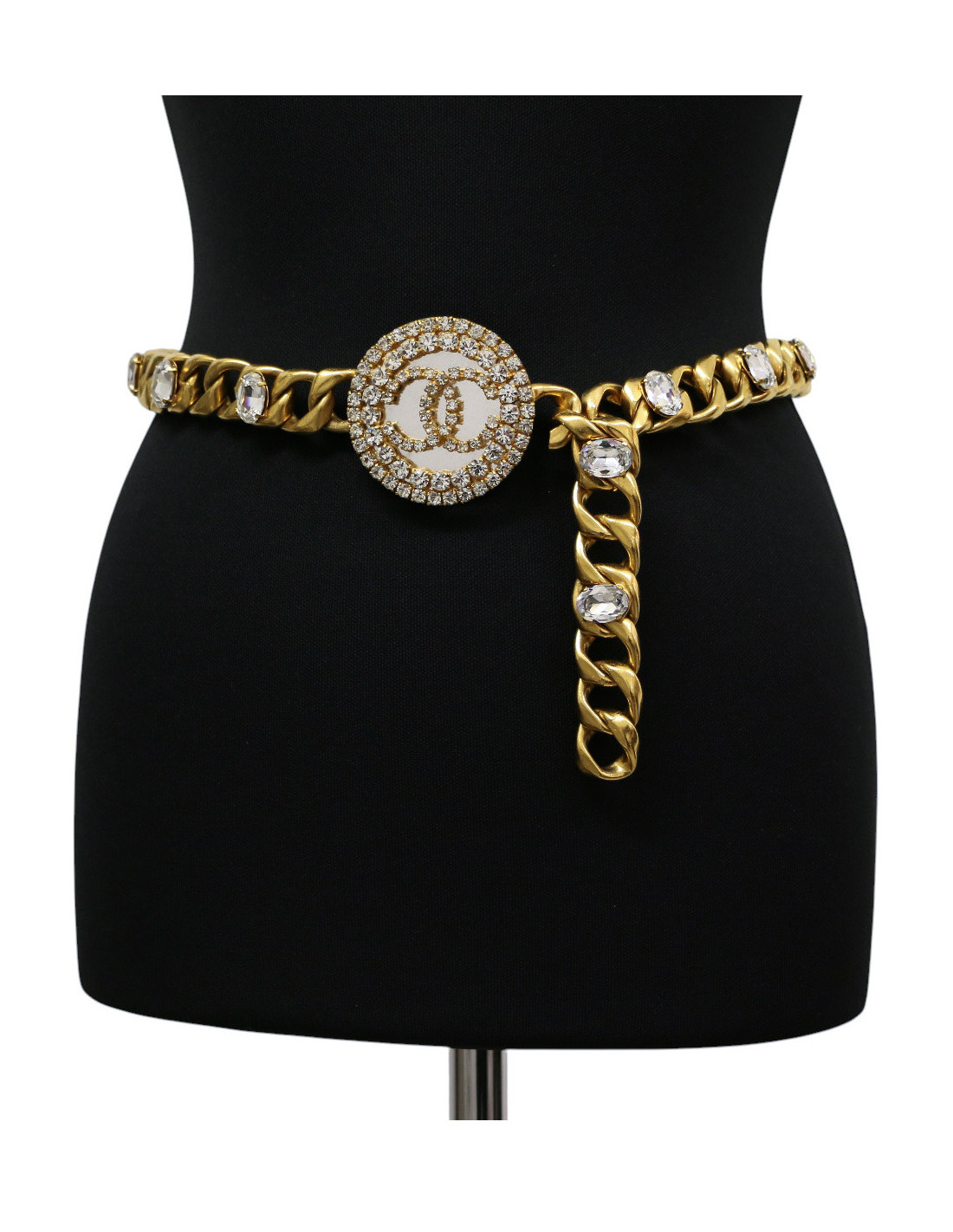 Détails : imposante ceinture dont la chaîne aux larges maillons est agrémentée de strass. Boucle ronde miroir sertie de strass formant le logo CC.