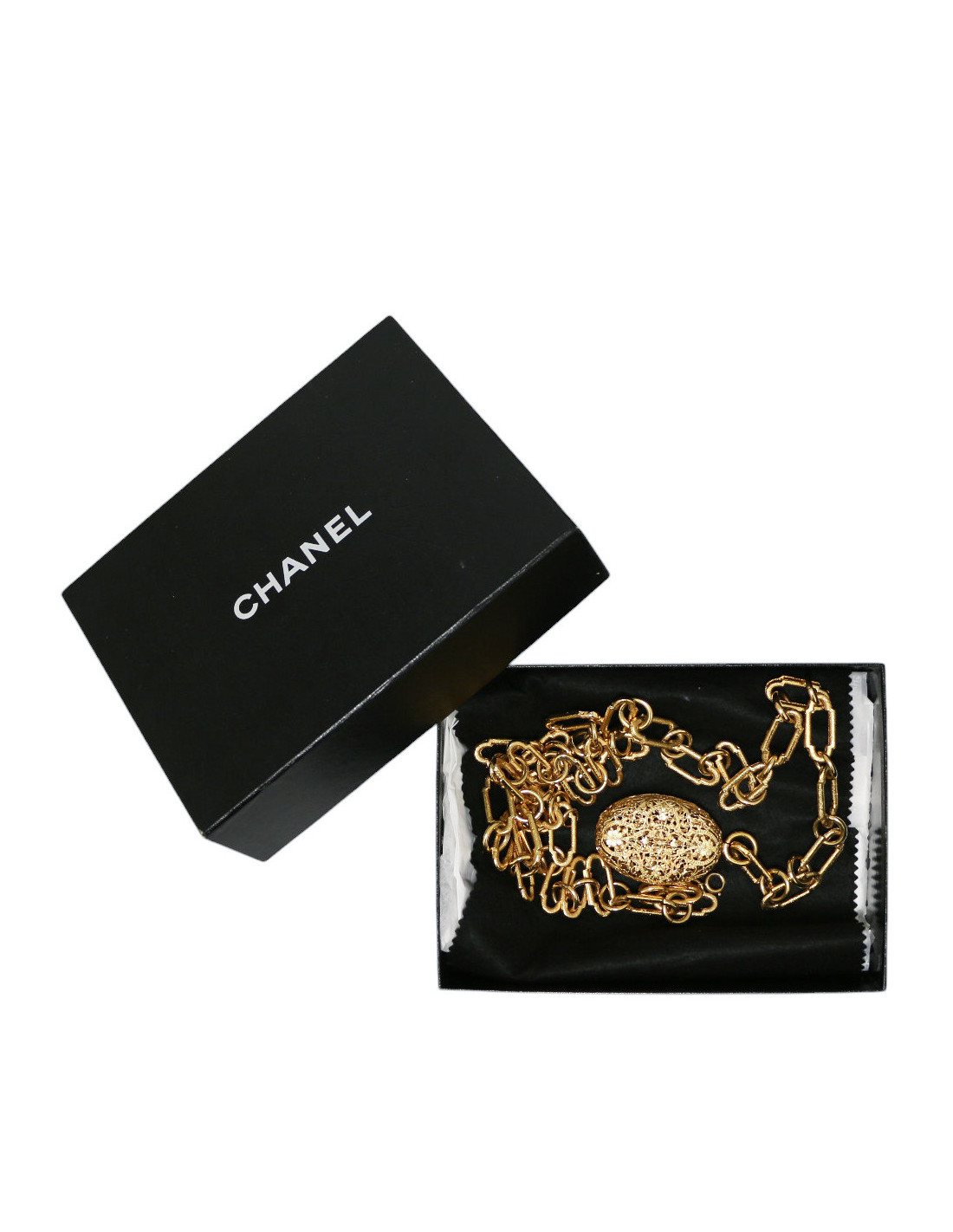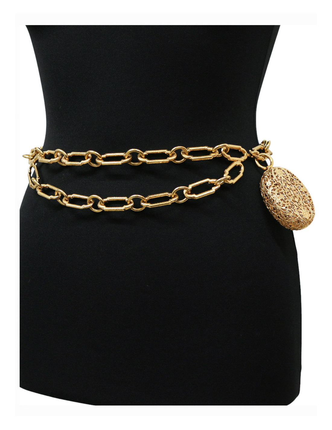 Détails : bijou créé par Goossens pour la Maison CHANEL. Il peut se porter de deux façons : en ceinture fermée par un crochet ou en collier grâce à la petite chaîne amovible. Le pendentif est en filigrane doré
