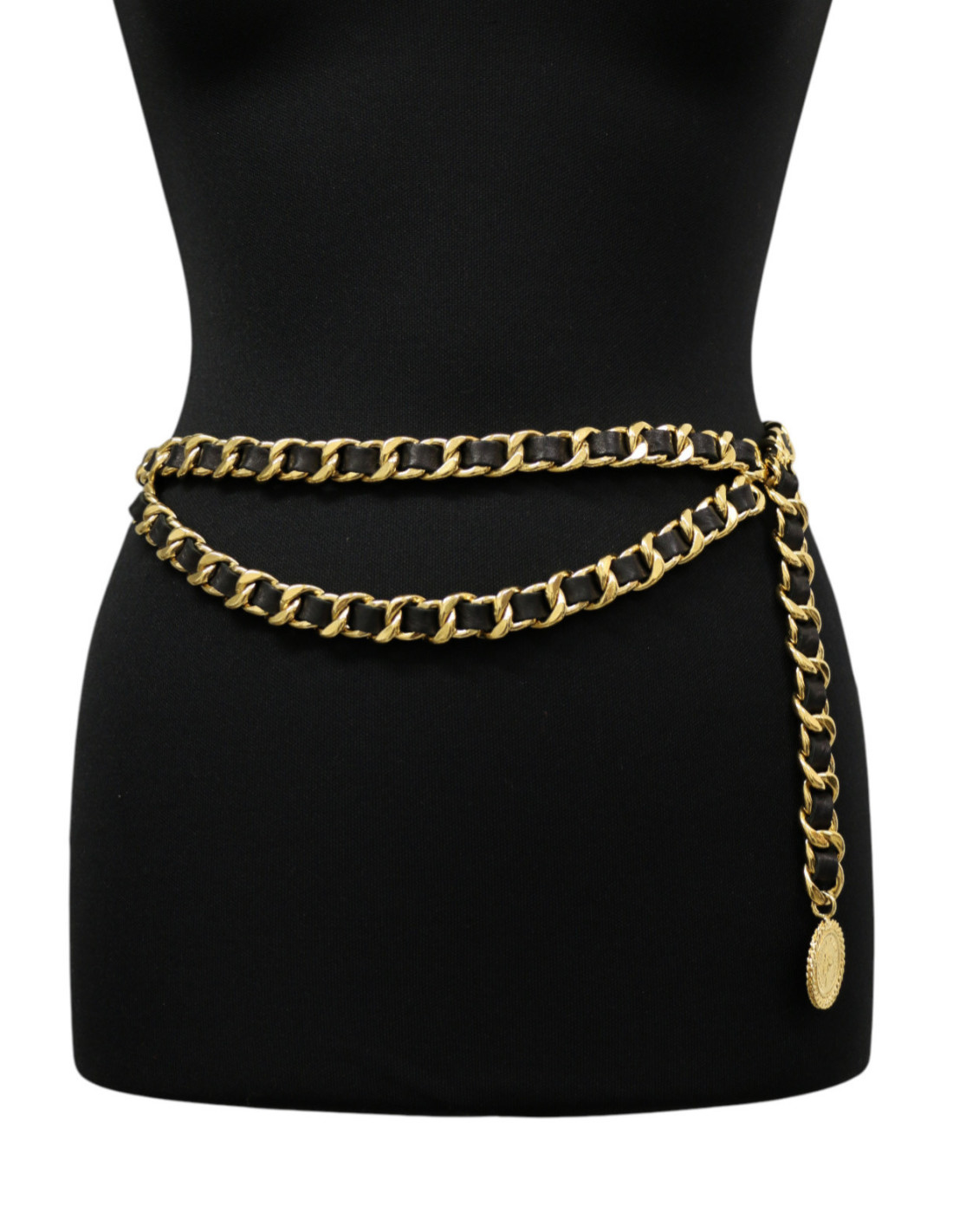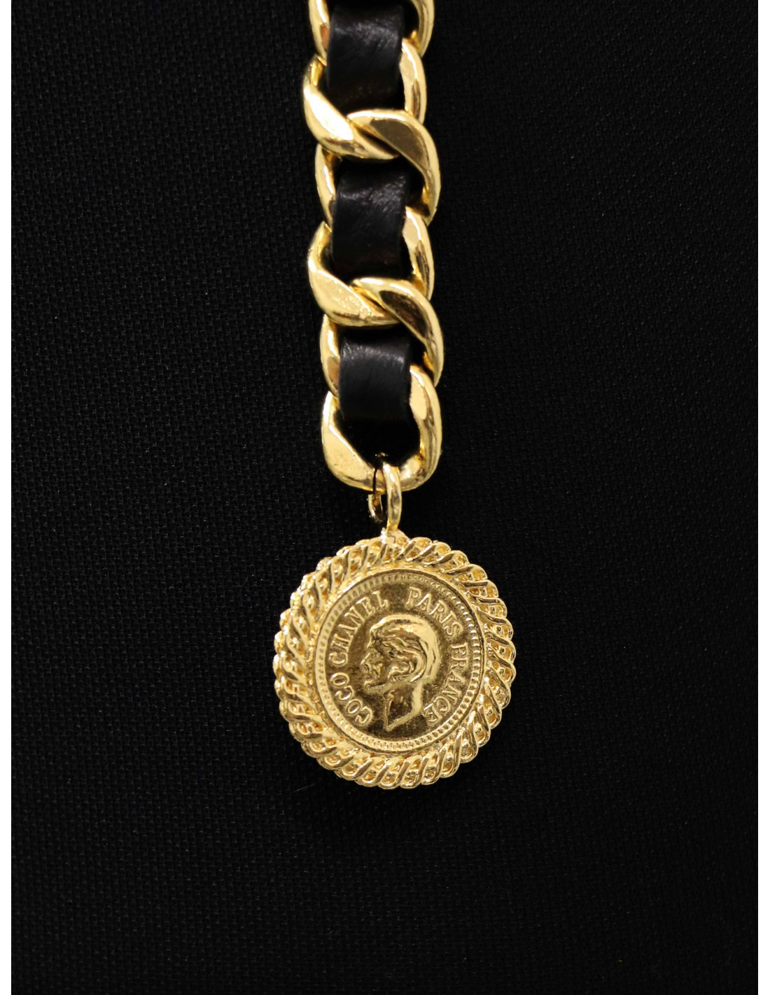 Détails : iconique ceinture vintage chaîne en métal doré entrelacée de cuir, médaillon doré double face : un côté avec un CC surmonté d'une couronne et l'inscription "Chanel 31 rue Cambon Paris", et l'autre avec le visage de profil de Gabrielle Chanel et l'inscription "Coco Chanel Paris France"