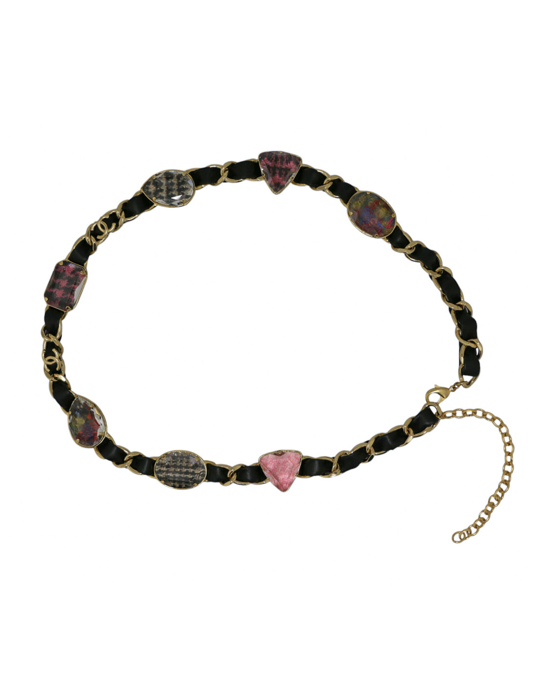 Détails : emblématique ceinture chaîne et cuir ornée de larges cabochons transparents avec tweed multicolore à l'intérieur.