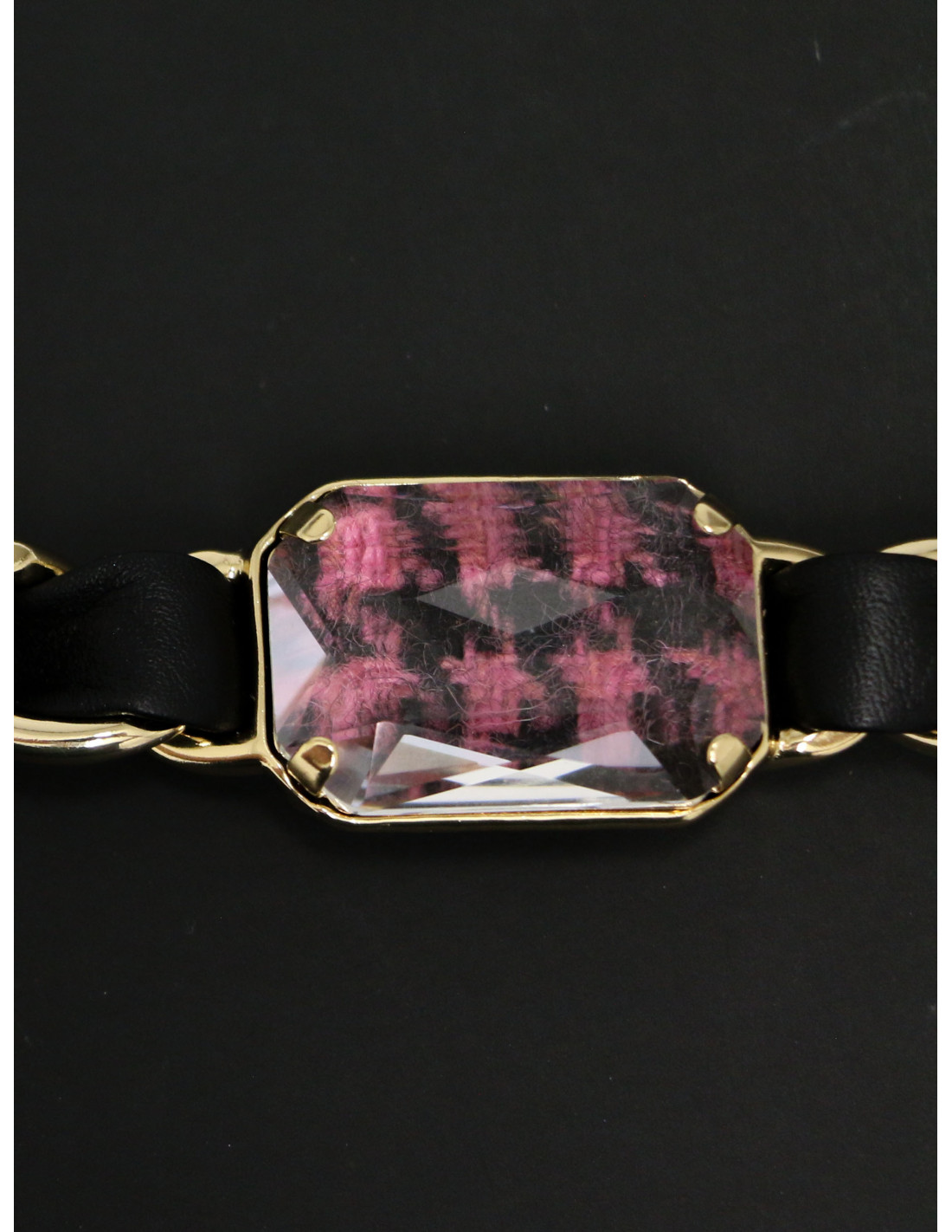 Matière : métal, cuir, strass, tweed