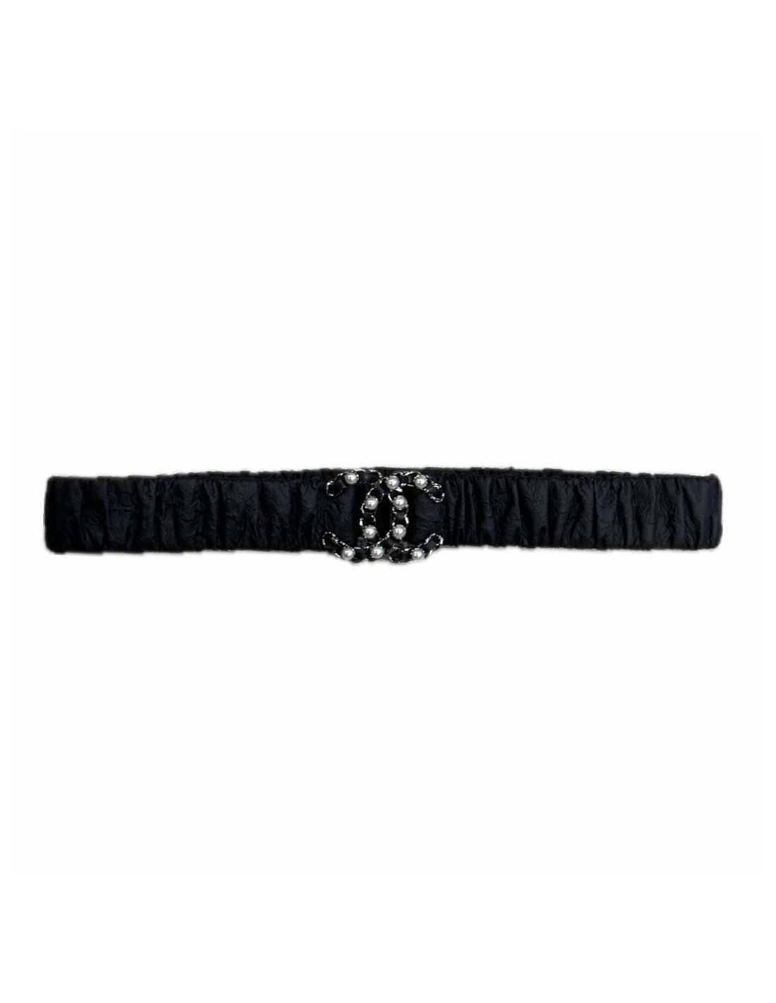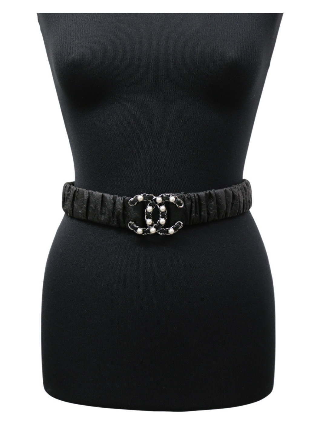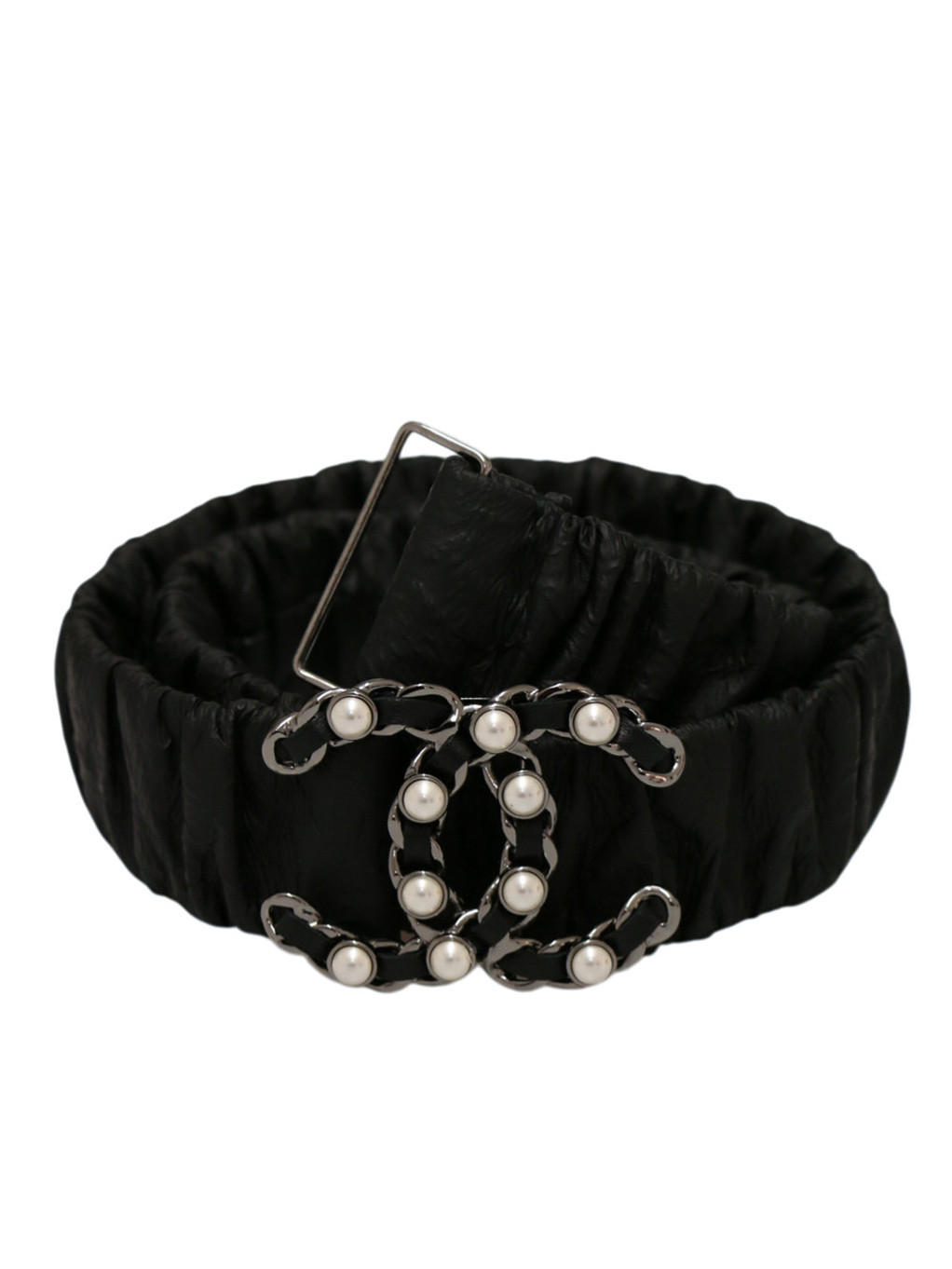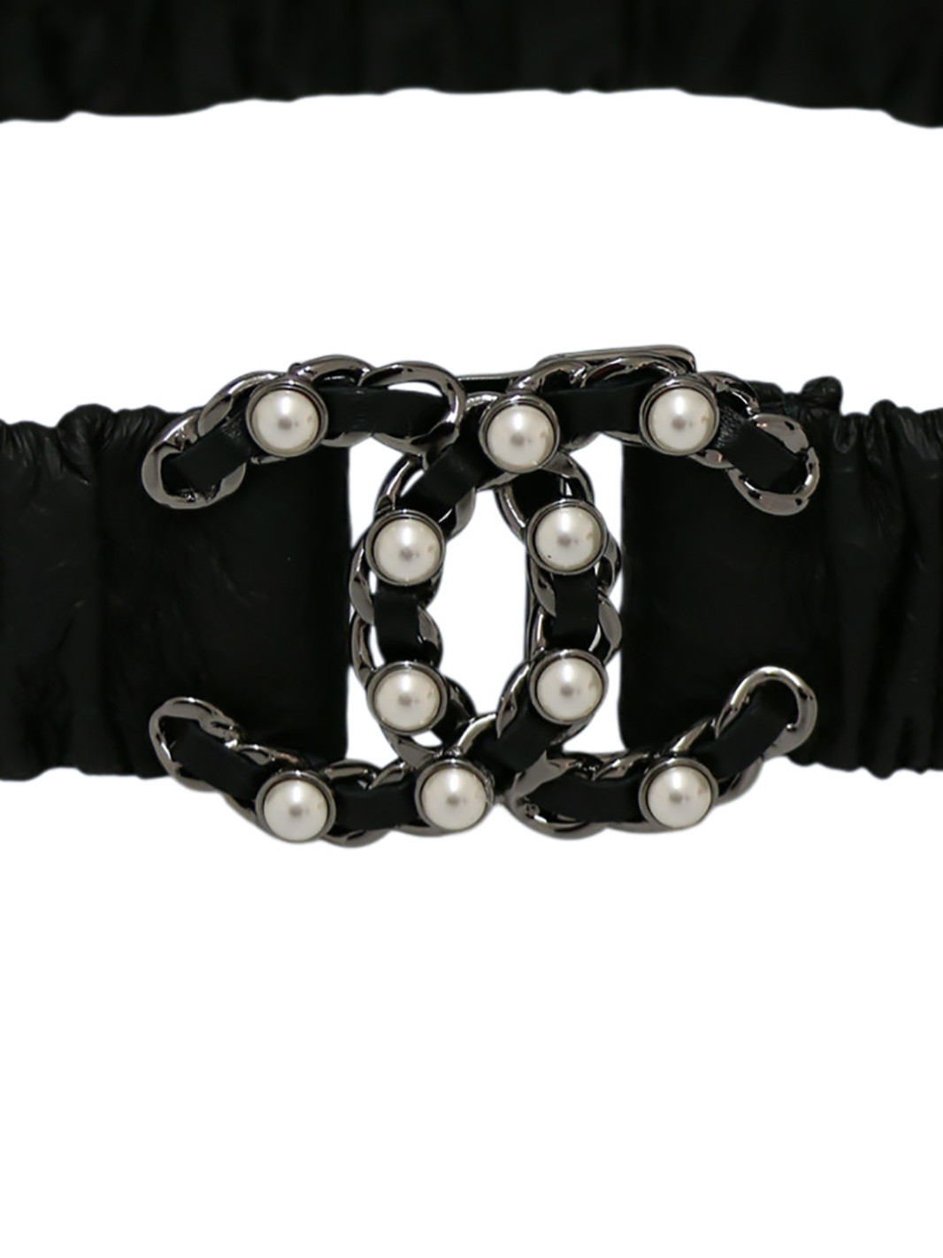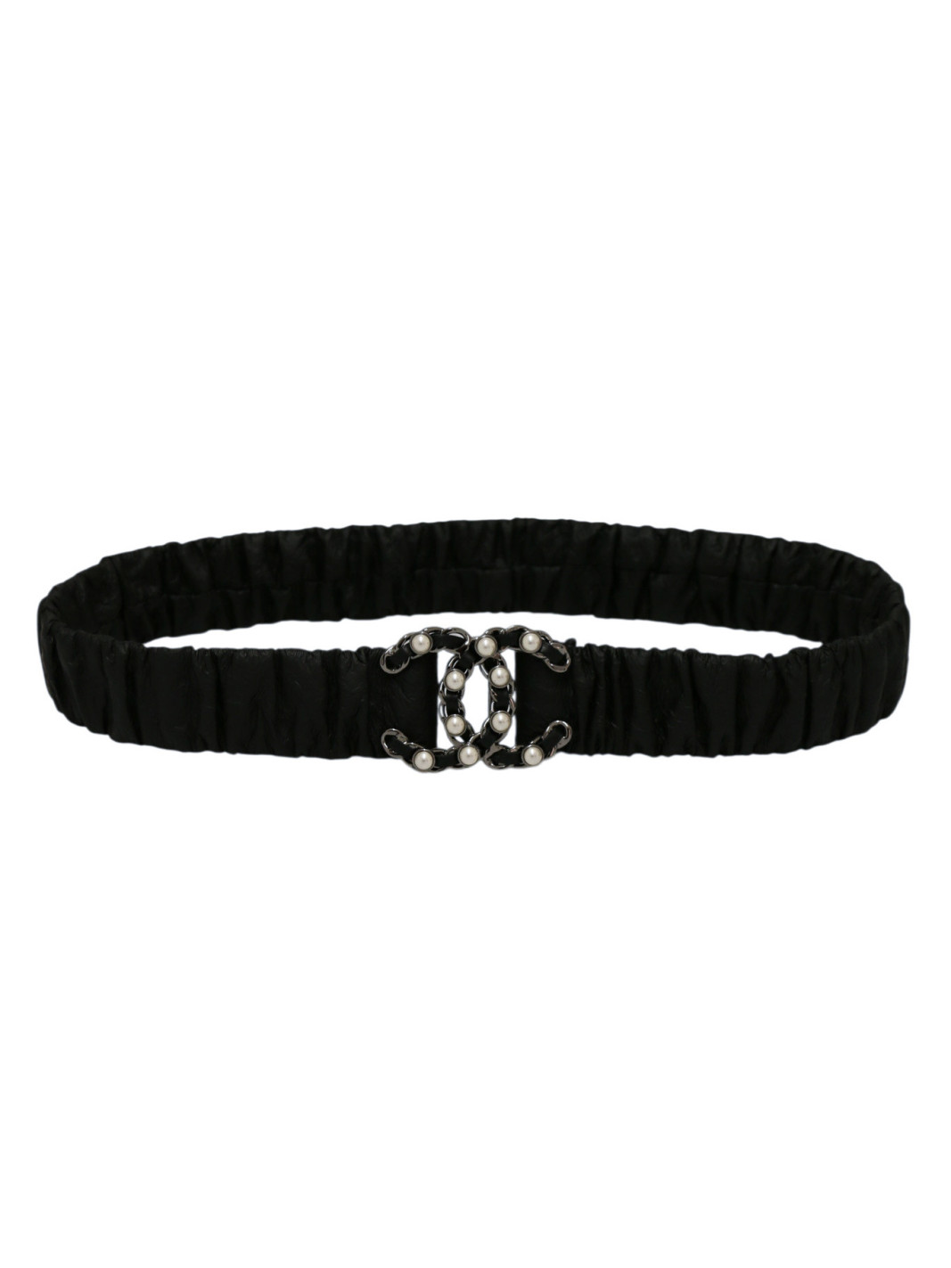 Ceinture Chanel Cuir Noir Élastiqué, Boucle Double C Perlée