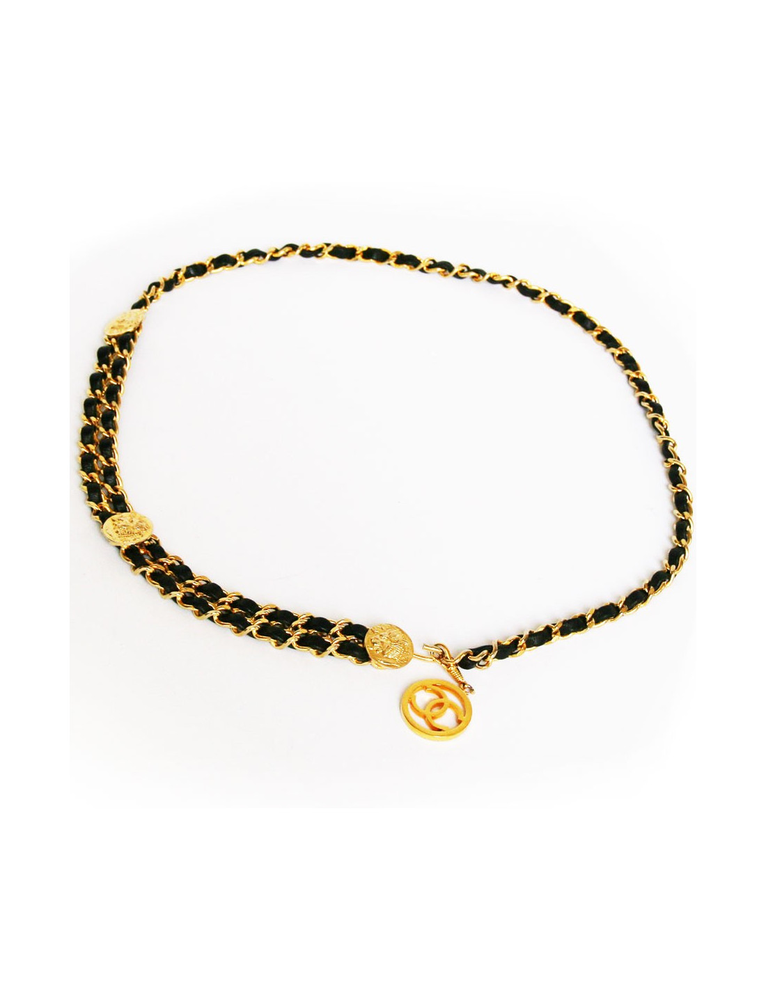 Ceinture CHANEL 5 rangs de perles noires et chaîne métal argent noirci