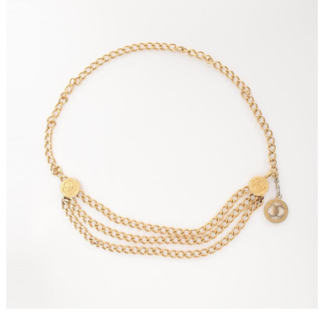 Iconique ceinture vintage, datant de 1984, avec estampille sur le crochet. Cette pièce est composée de trois rangs de chaînes dorées plaquées or 24 carats. Elle est ornée de médaillons ronds finement travaillés, chacun estampillé du mythique logo double C, ainsi que d'un charmant pendentif CC. Complètement ajustable, elle est très polyvalente : elle est idéale pour souligner une taille, draper une robe fluide ou rehausser un pantalon. Présentée en excellent état vintage, cette ceinture est bien plus qu'un accessoire : c'est une véritable œuvre d'art portable ! Avec une longueur totale de 88 cm, cette ceinture convient à toutes les tailles jusque 85.