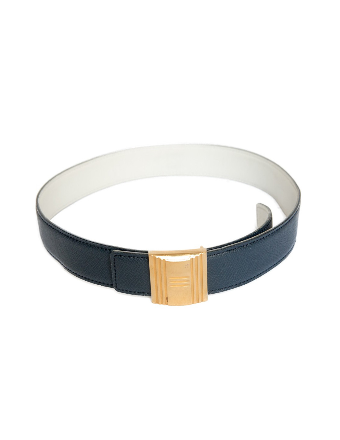 Ceinture Cadenas Hermès réversible, un côté en cuir epsom bleu marine et l'autre en cuir epsom blanc.