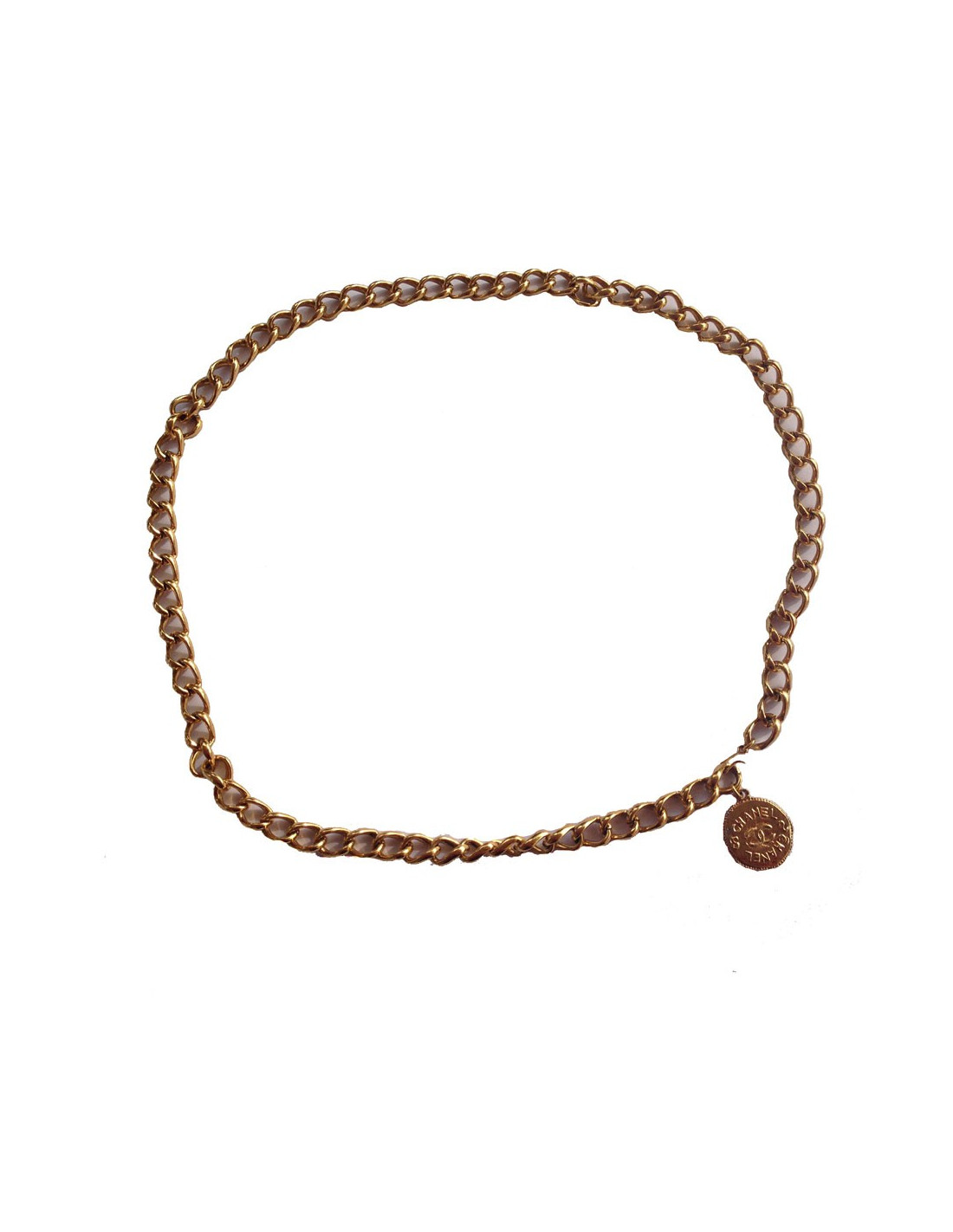 90's!!!! Très belle et intemporelle ceinture de la maison CHANEL en chaîne dorée. Vintage. La ceinture se termine par une médaille au sigle CC d'un côté et de l'inscription CHANEL de l'autre. Le doré est légèrement passé sur un petit coin de la médaille. Fermeture par un crochet. En très bon état.