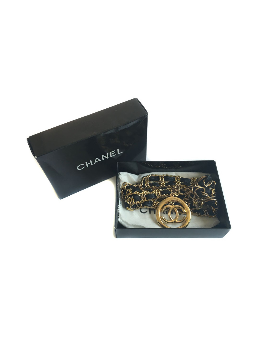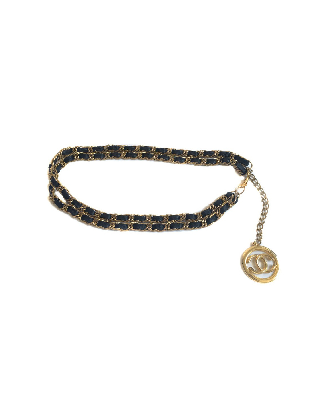 Ceinture CHANEL vintage double rang en chaine dorée entrelacée de cuir noir. La ceinture se termine par un CC dans un rond, le tout en métal doré. La dorure est un peu passée sur l'ensemble de la ceinture.