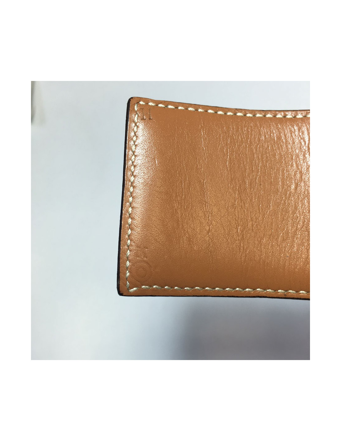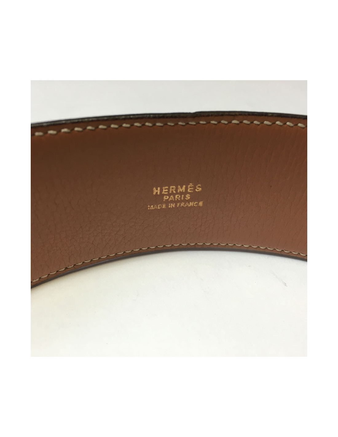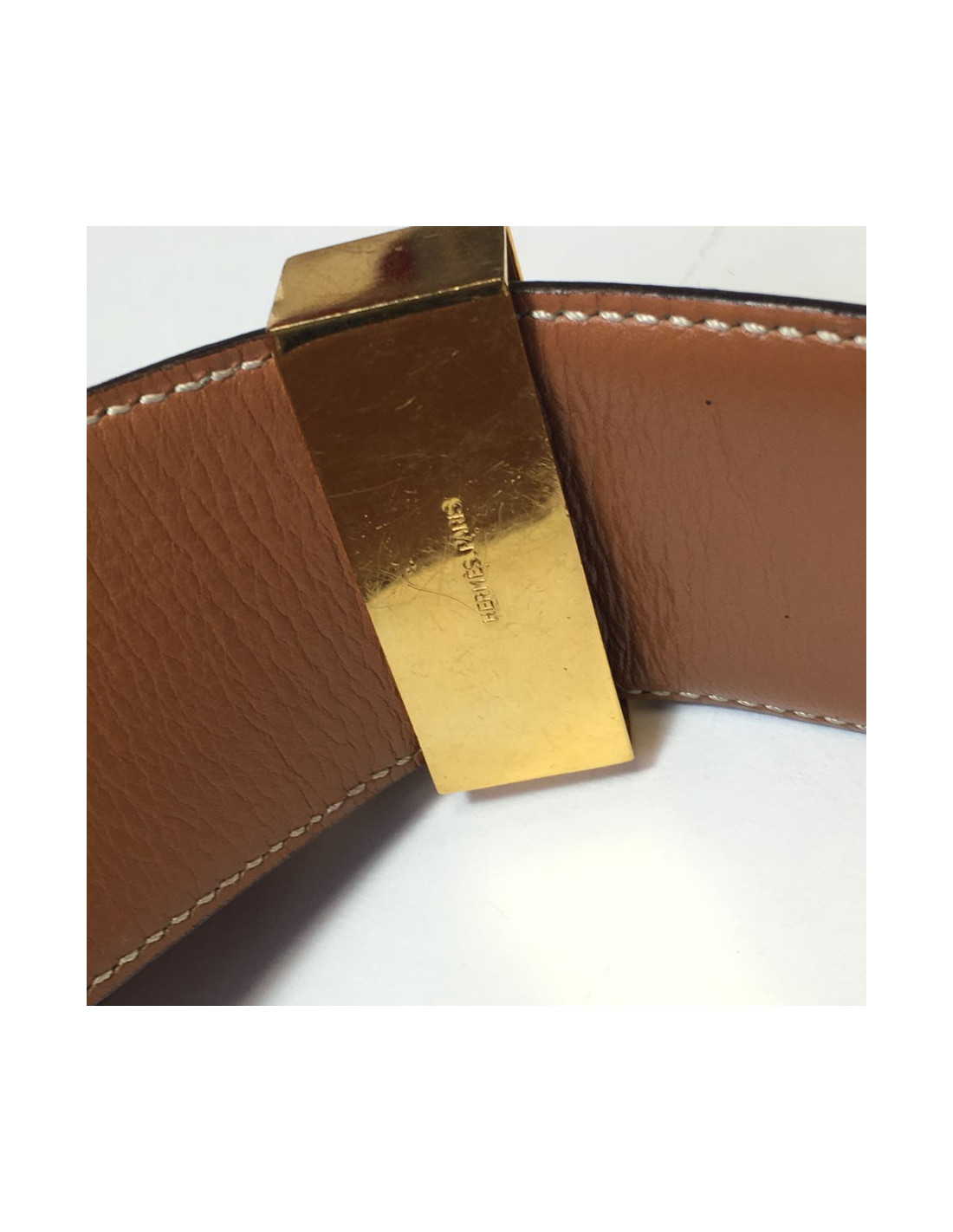 Ceinture HERMES "Médor" en cuir gold et bijouterie en métal doré. Quelques rayures sur l'ensemble de la bijouterie. Lettre O dans un rond. En très bon état général. T80 environ