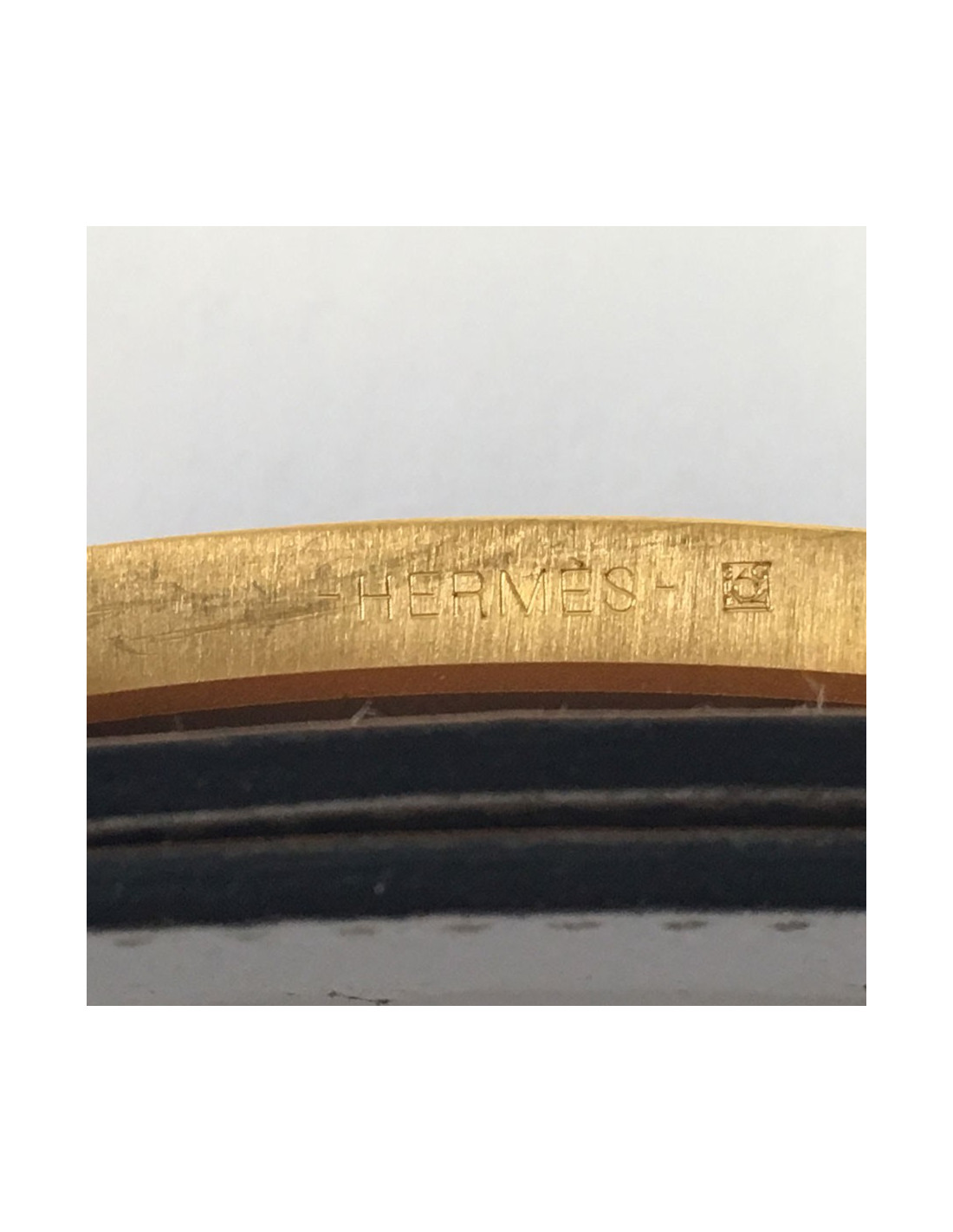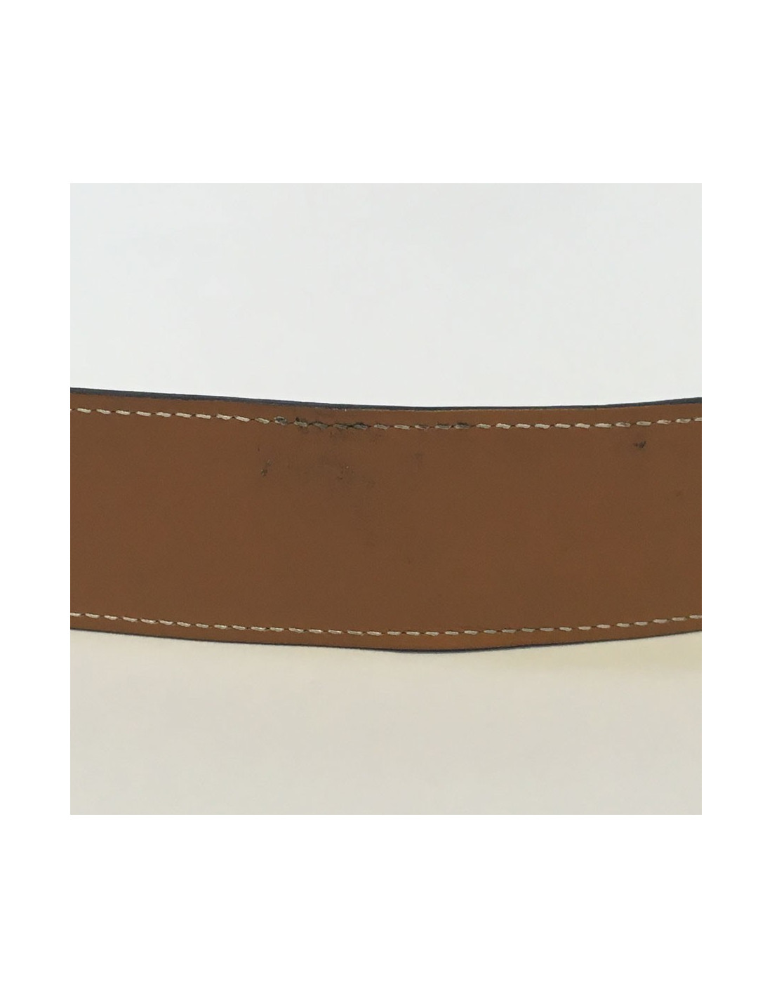 Des traces sur le cuir gold, traces côté cuir blanc au niveau du fermoir H. Le fermoir présente quelques rayures. En très bon état général.