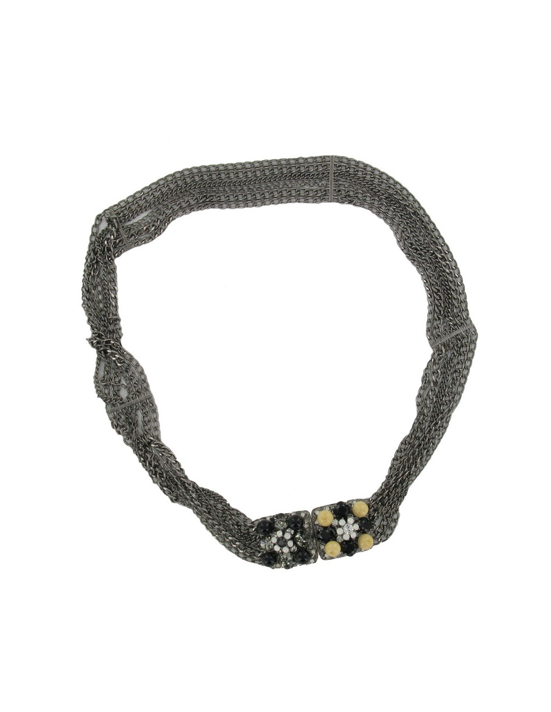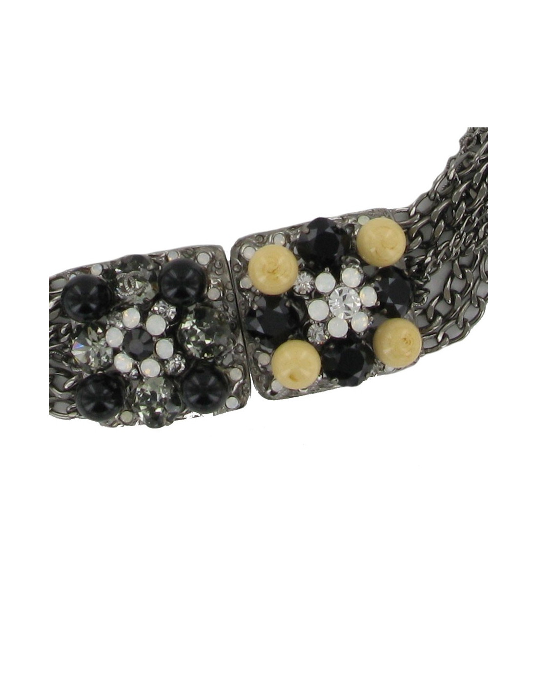 Boucle en métal ruthénium sertie de perles en pâte de verre beige et noire, de pierres Swarovski blanches, noires et transparentes. Composée de 7 chaînes ruthénium.