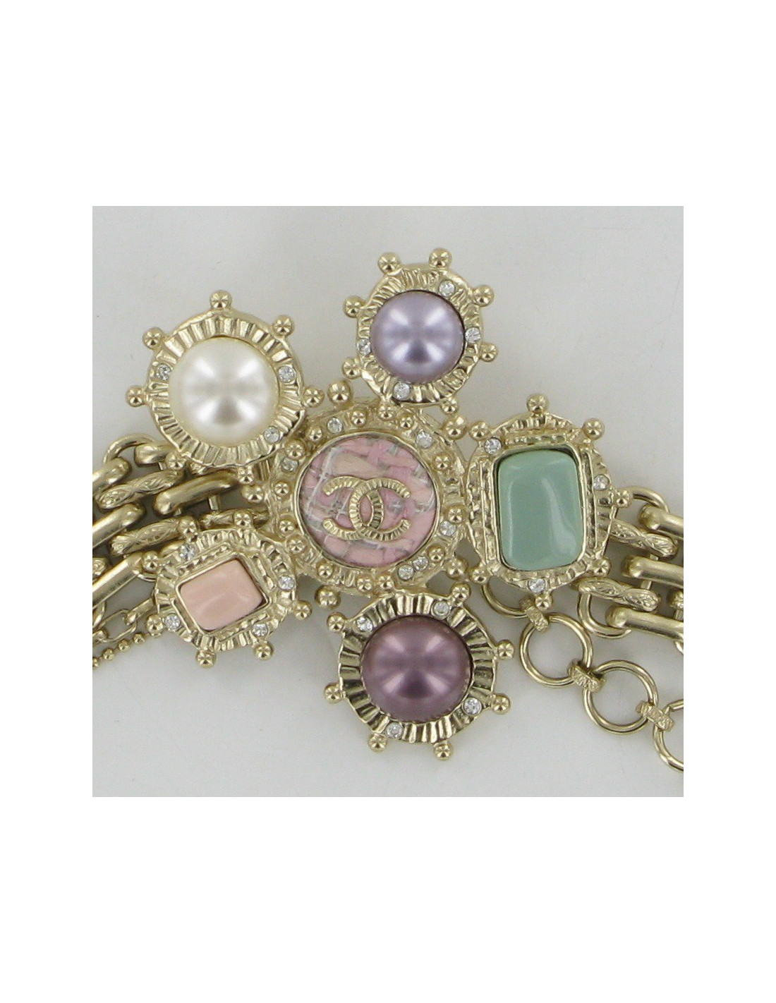 Détails : boucle bijou en métal or pâle sertie de cabochons nacrés, rose pâle, vert et mauve, et petits cristaux. Au centre, empiècement rose en tweed avec logo CC en métal doré
