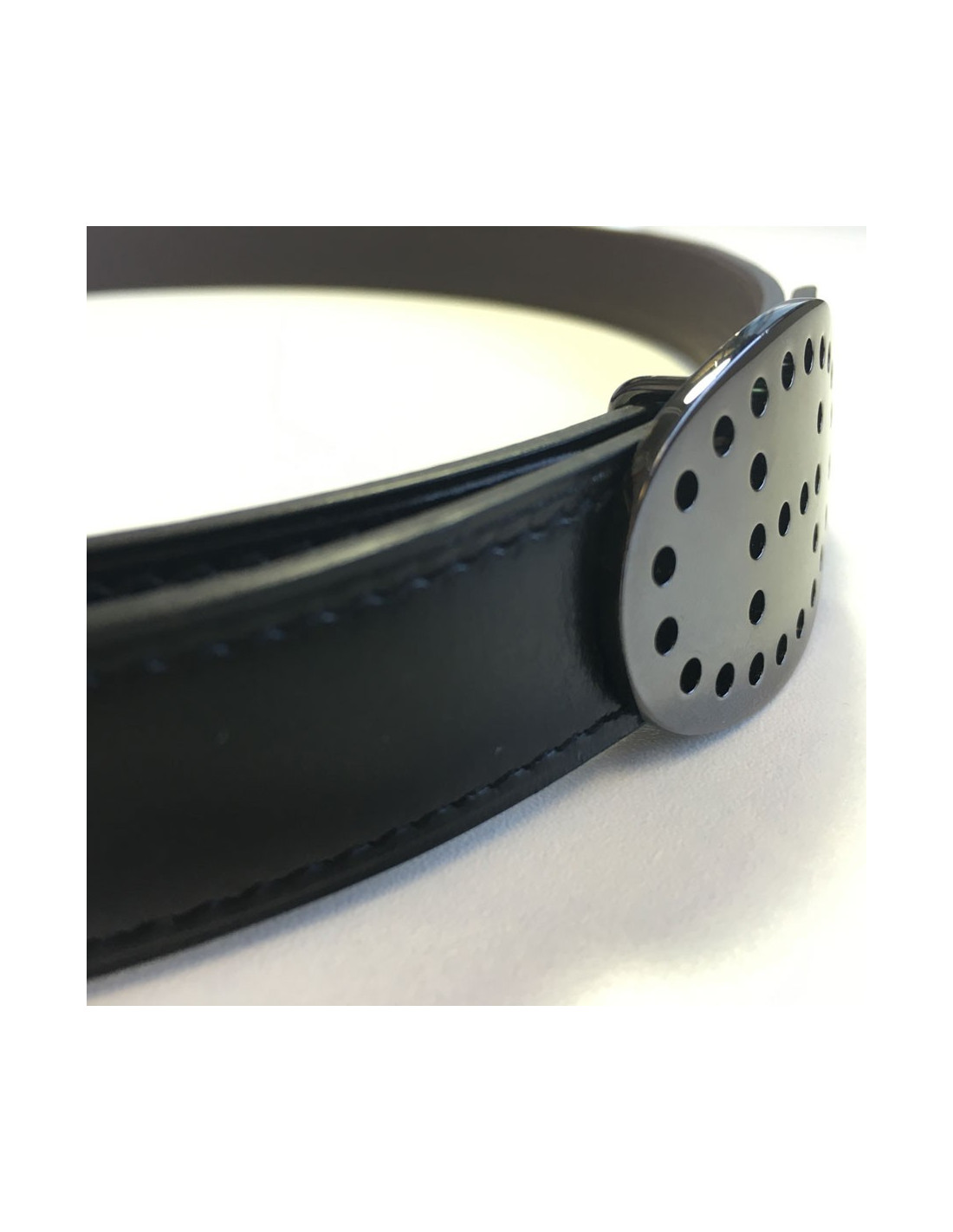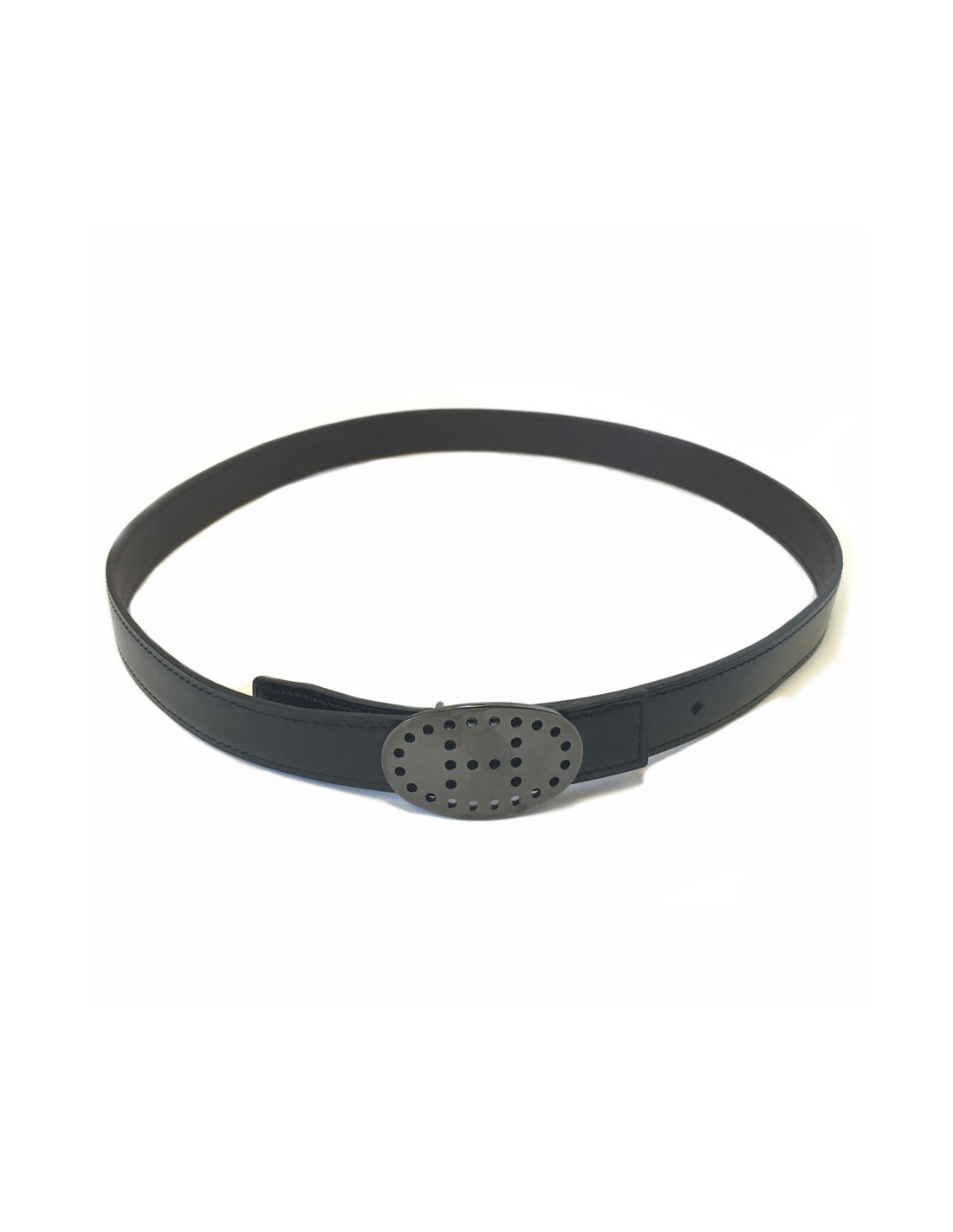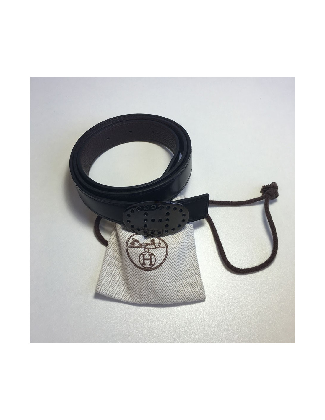 Ceinture HERMES réversible en cuir box noir et cuir veau grainé marron. Boucle en métal argenté noirci. H perforé sur la boucle. ceinture en parfait état.