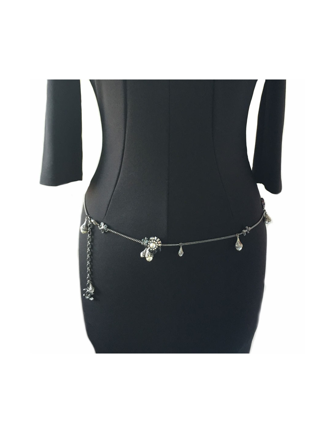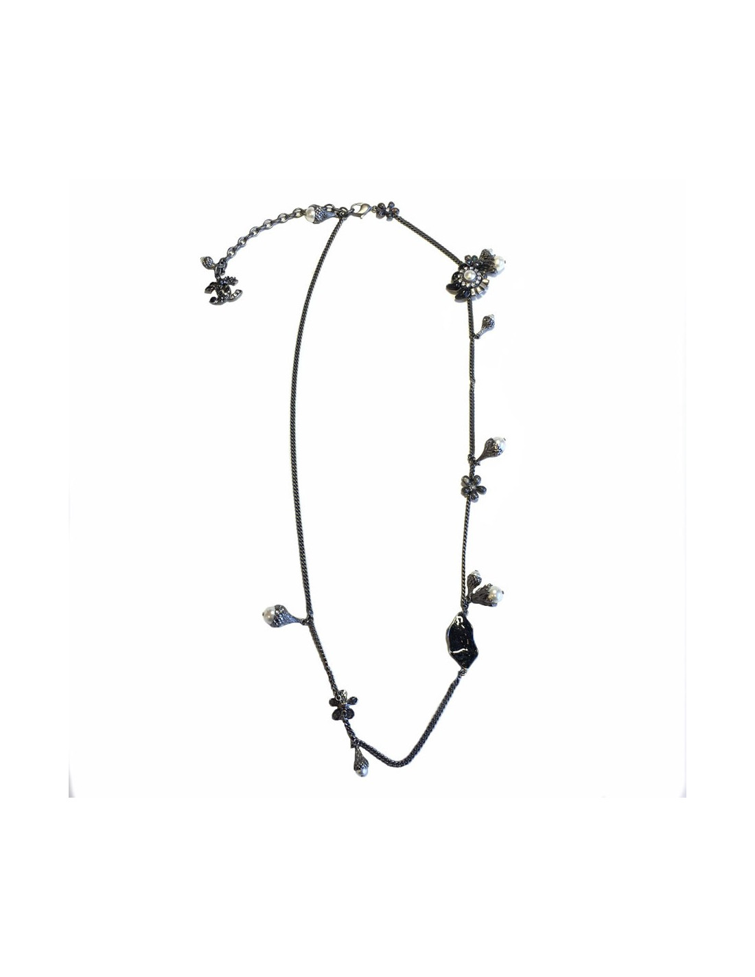 Ceinture sautoir CHANEL en chaine argentée, perles nacrées, fleurs et CC