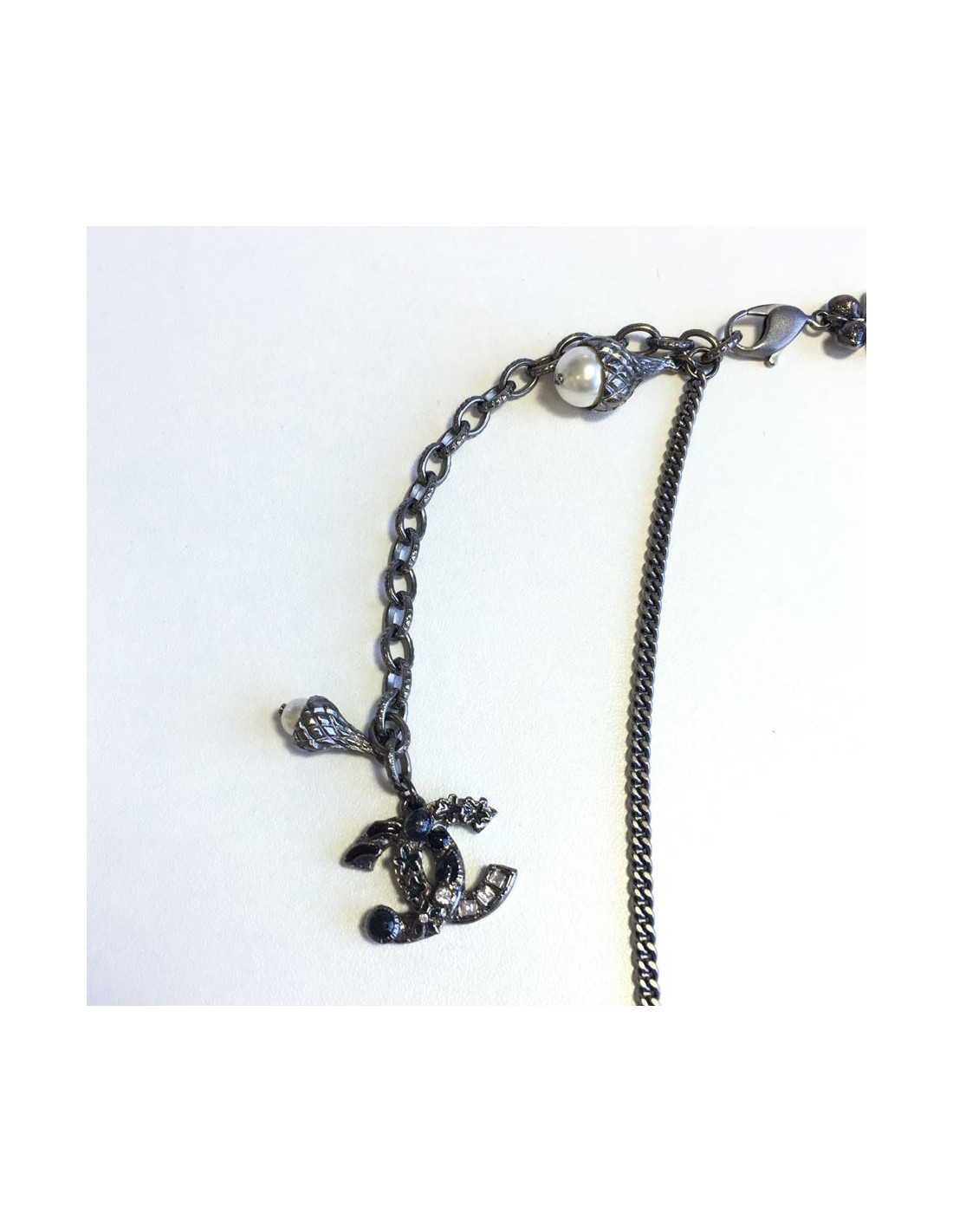 Superbe ceinture-sautoir CHANEL en chaîne argentée noircie, perles nacrées, fleurs en résine pailletée, pièce en résine noire, perle nacrée, strass et une bouche en résine noire pailletée.