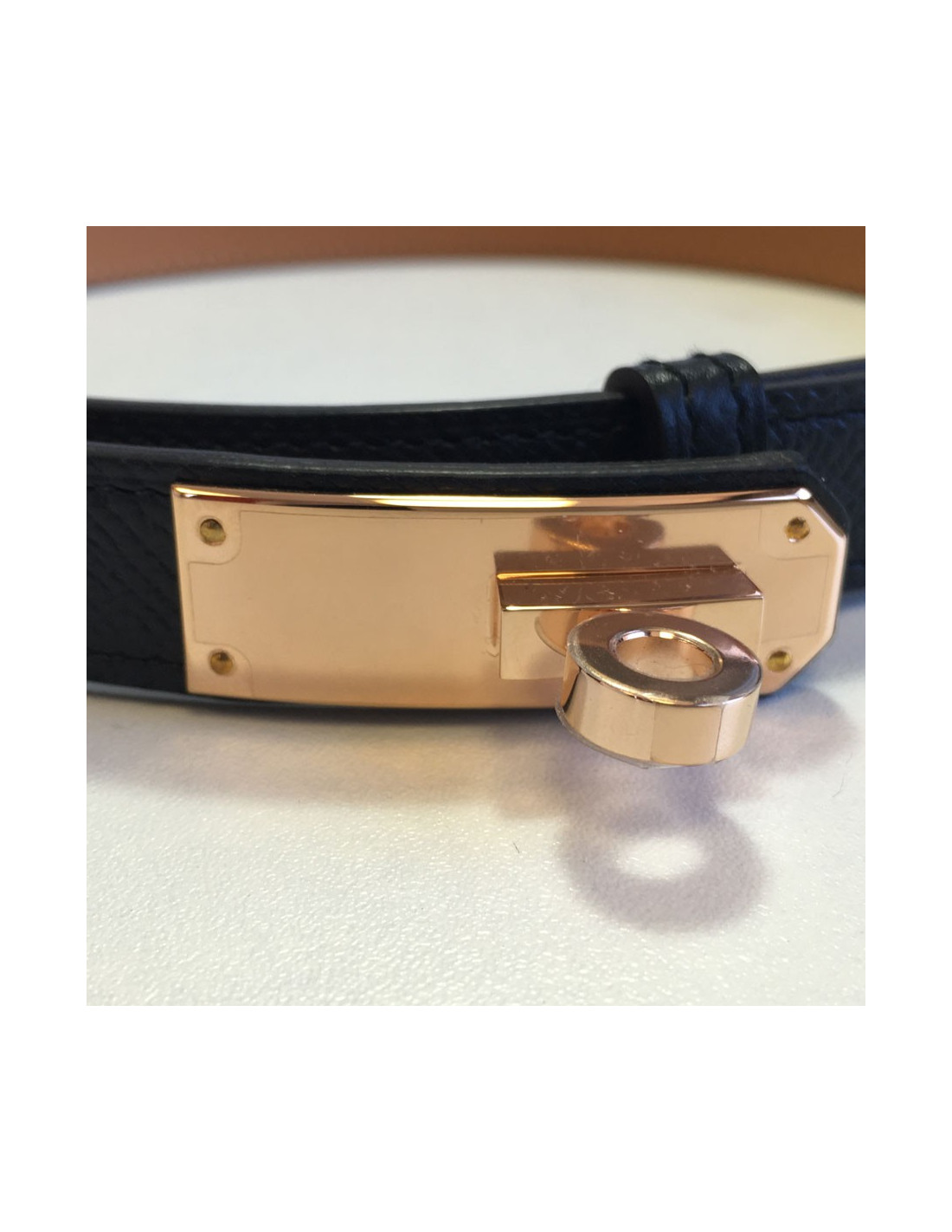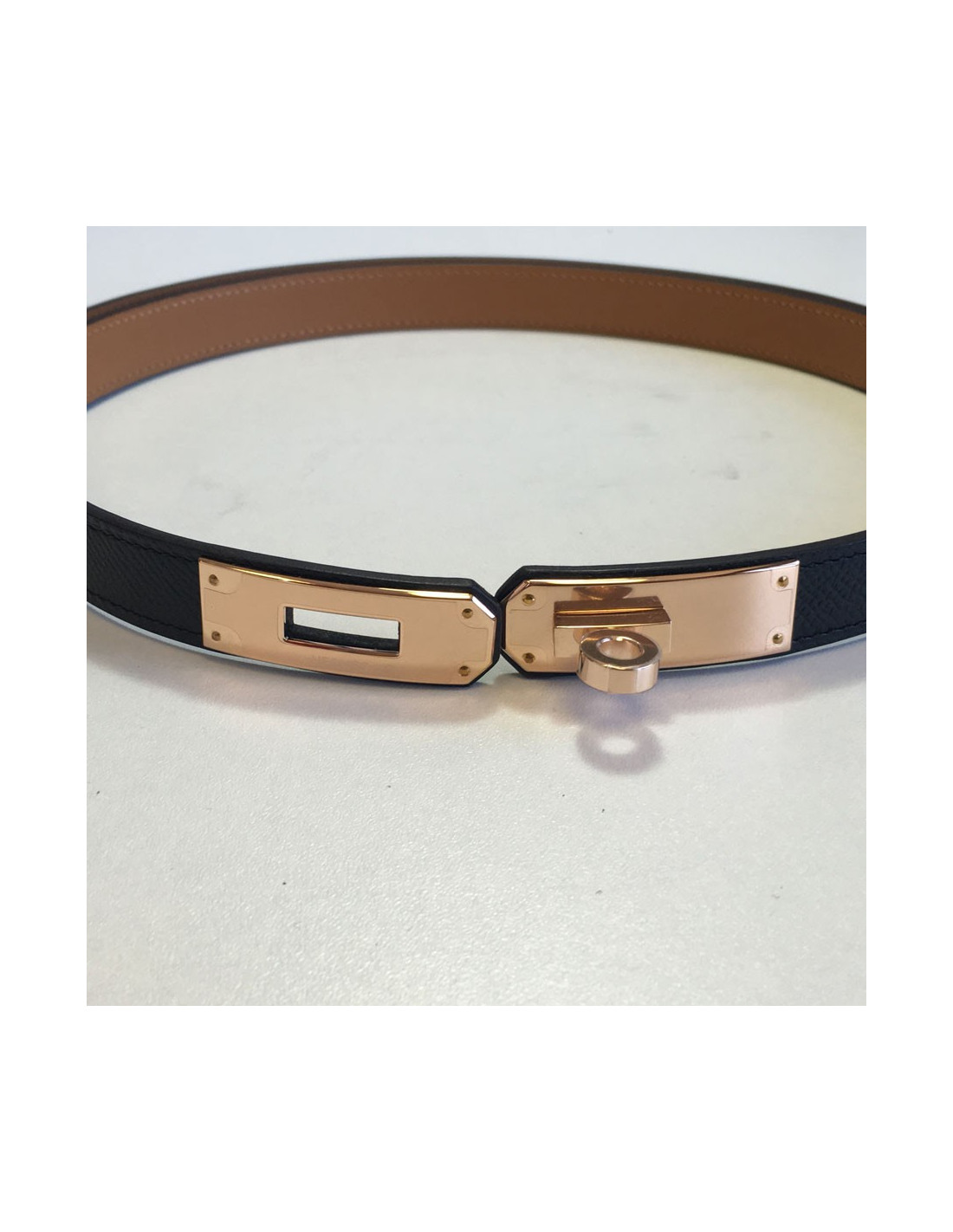 Superbe ceinture Kelly HERMES en veau epsom noir, intérieur en cuir gold, fermoir en métal plaqué or rose.