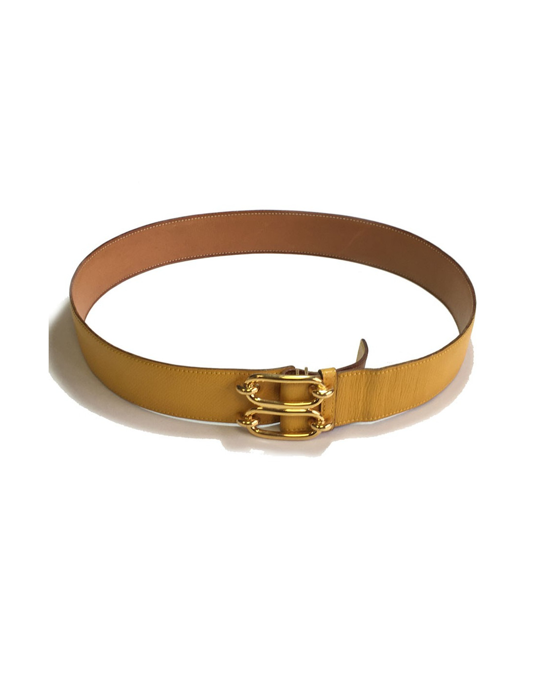 Ceinture Hermès vintage en cuir courchevel jaune et cuir lisse gold (réversible), petits plis d’usure au niveau de la boucle côté jaune sinon rien d’autre à signaler. Côté gold, une légère trace sur le milieu. Fermoir en laiton doré impeccable.
