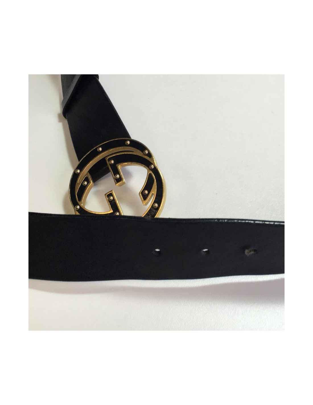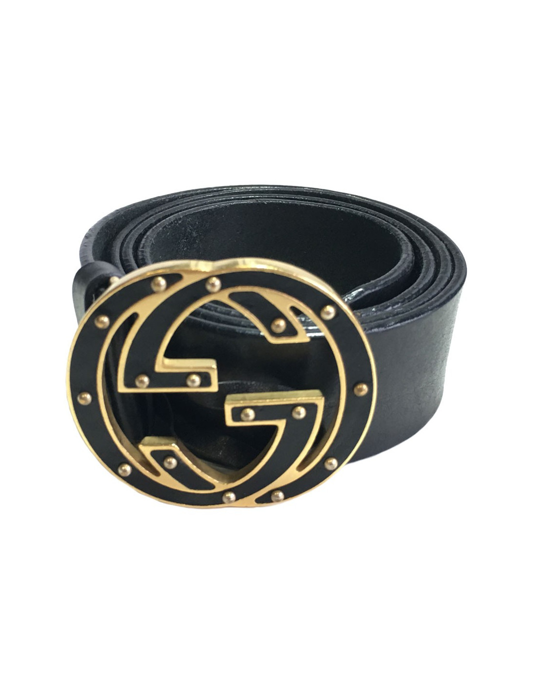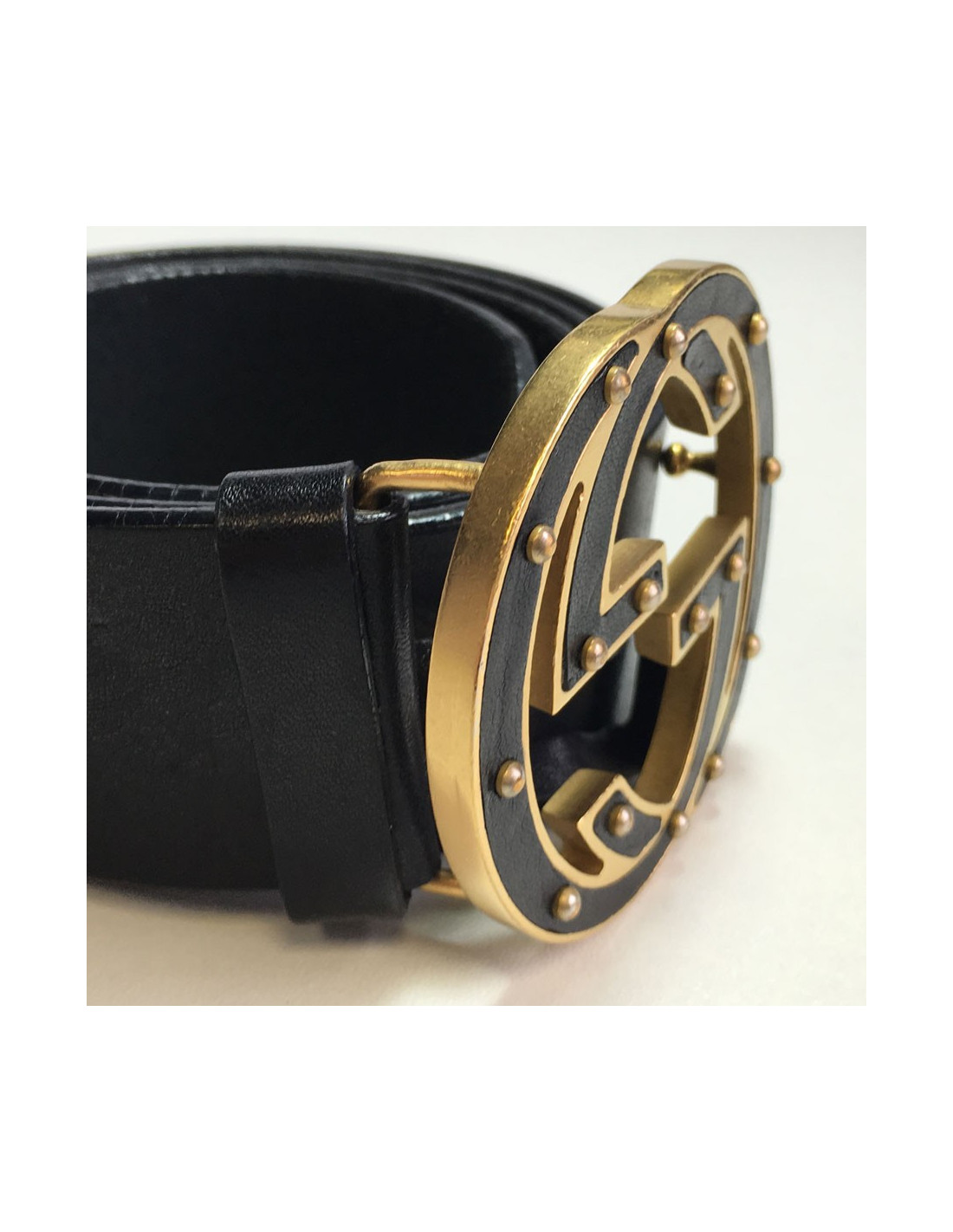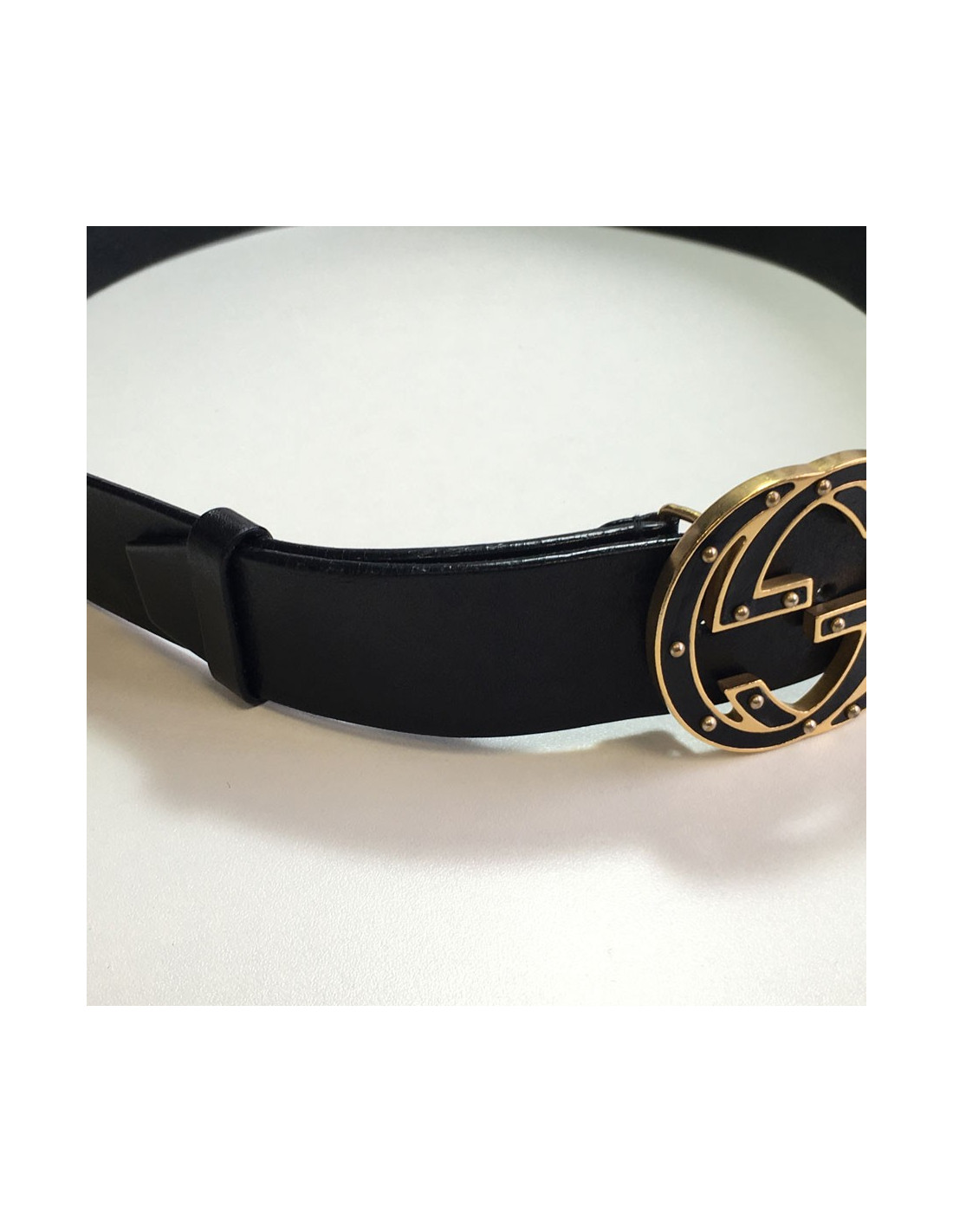 Ceinture Gucci en cuir noir mat et sigle en laiton doré mat avec incrustation de cuir noir.