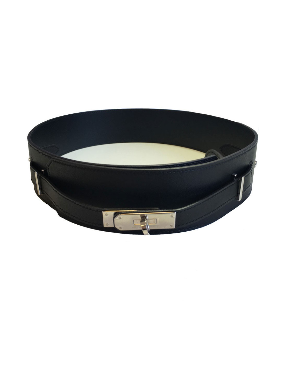 Superbe ceinture HERMES Diane en cuir veau swift noir, fermoir Kelly accastillage palladium