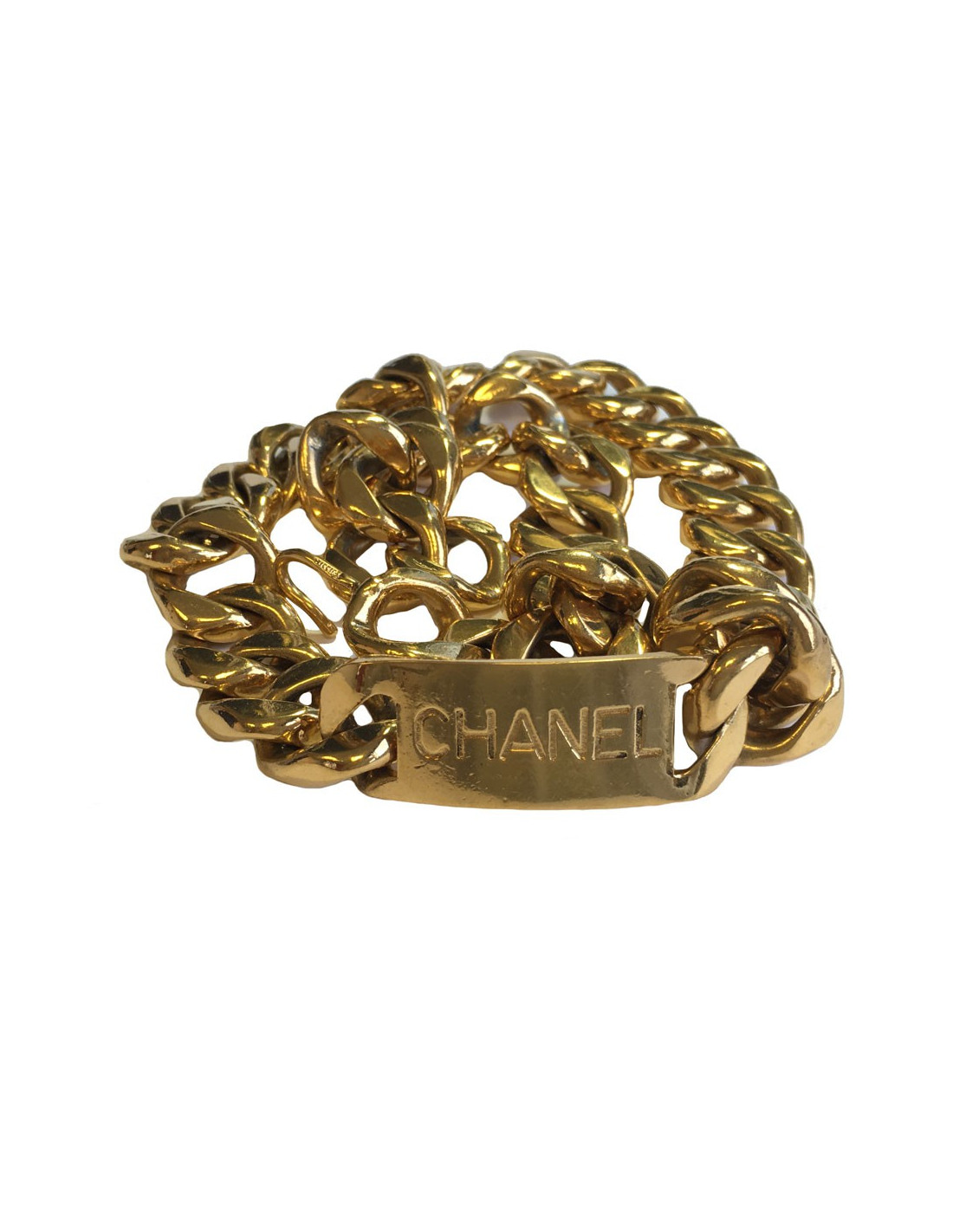80's!! Ceinture CHANEL 80’ chaine à grosse maille en métal doré. Au centre une plaque avec la marque CHANEL gravée sur le devant.