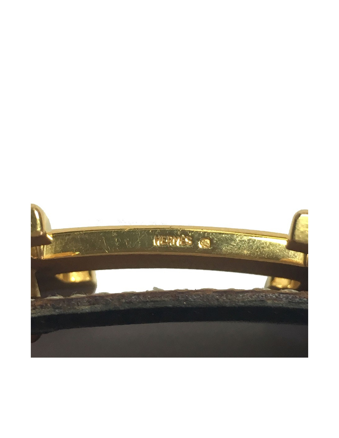 Ceinture H HERMES réversible en cuir gold et cuir marron et boucle en métal doré. Taille 76. Le cuir est en très bon état. La boucle comporte des rayures d'usage. Lettre V dans un rond.