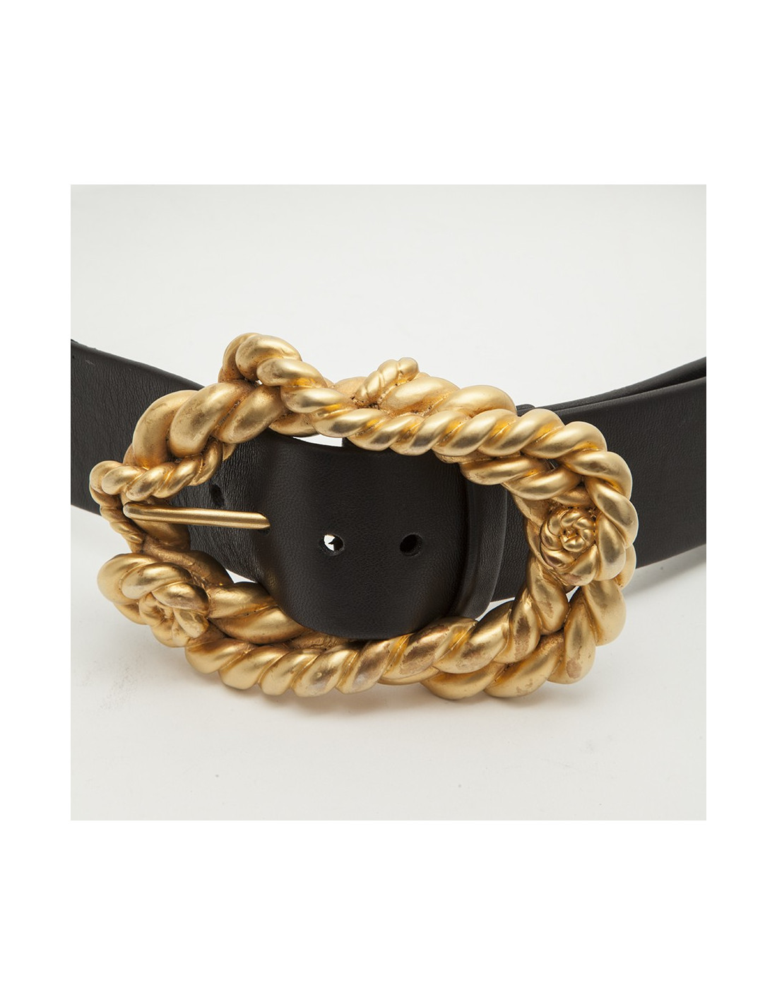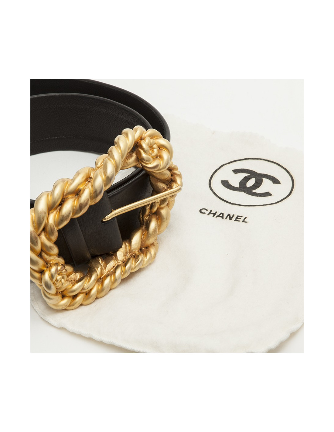 Vintage. Ceinture Chanel, couture dont la boucle est en résine dorée.